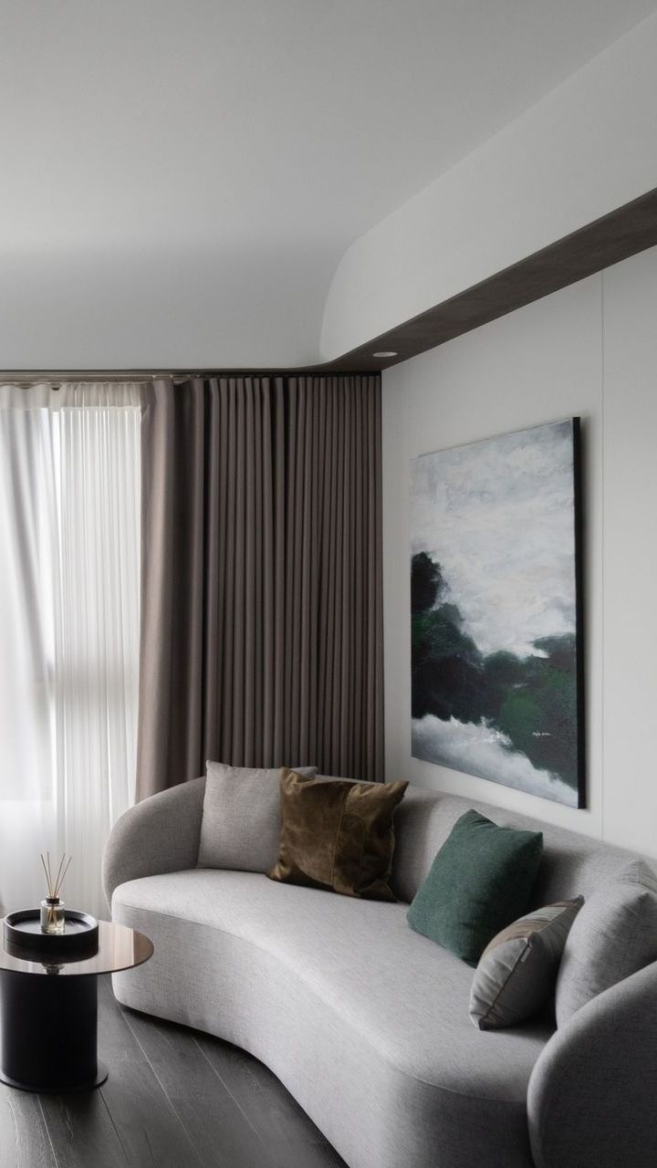 進入客廳,飛鏢型淺色布面沙發與茶色玻璃木作茶几完美契合,其背後的藝術畫作宛如都市中的一抹綠意,將自然的肌理呈現於空間牆面,綠葉被巧妙轉換成室內的氛圍點綴,讓畫作成為一扇令人心曠神怡的窗景。