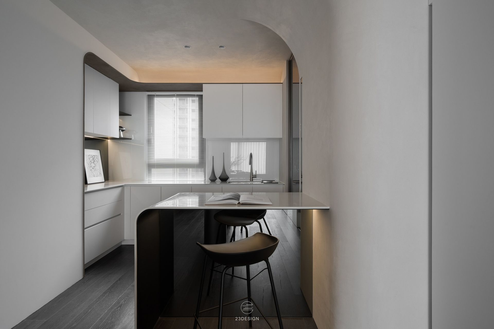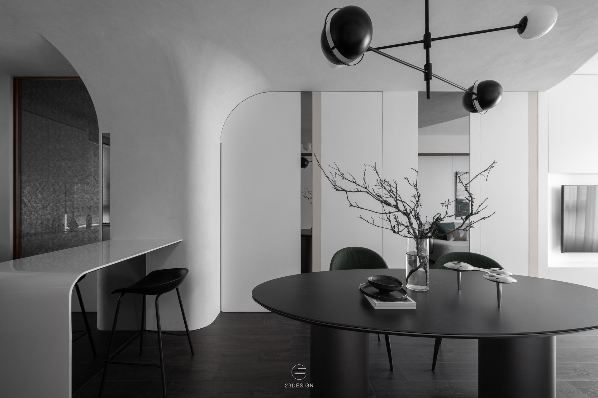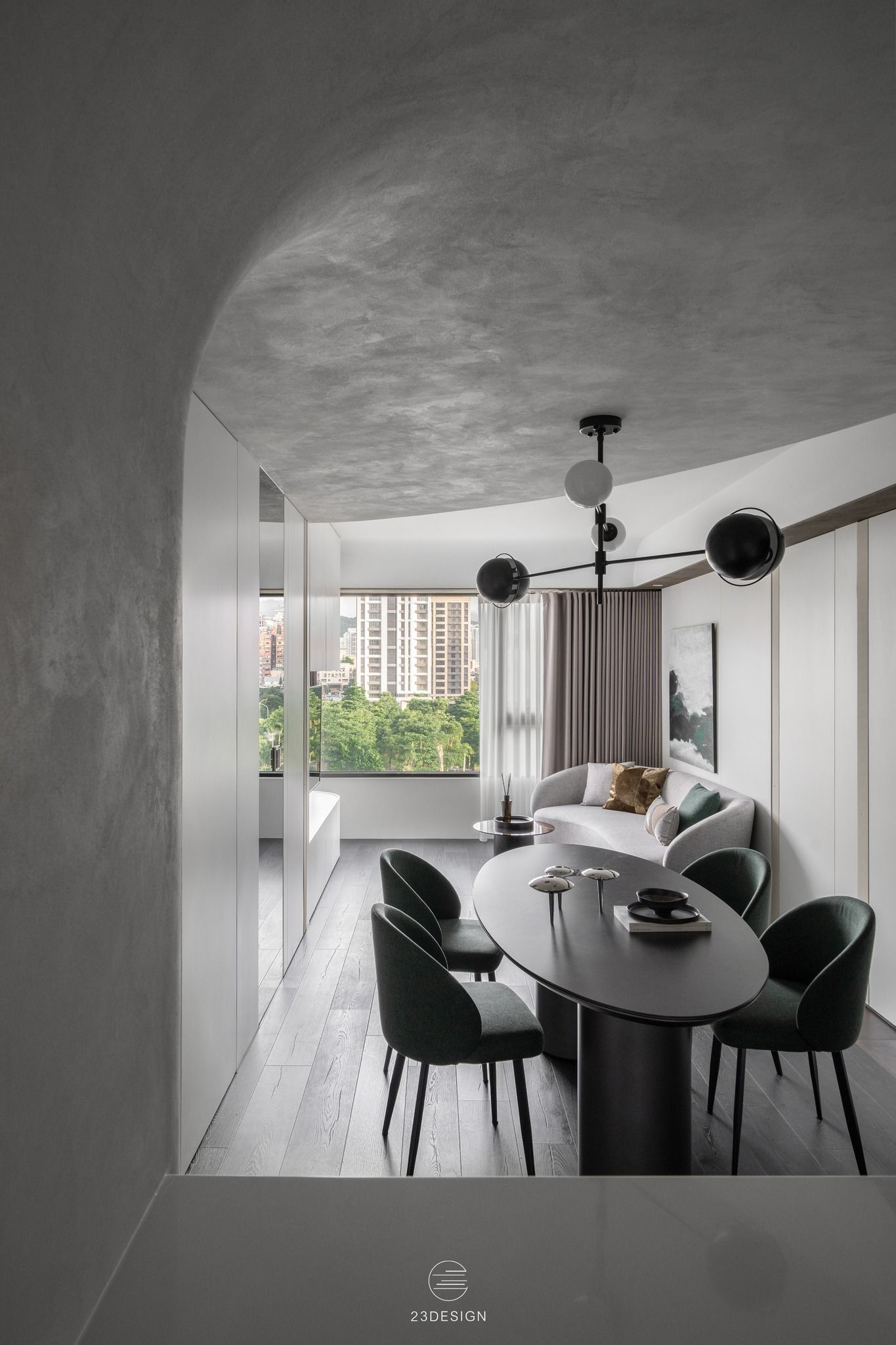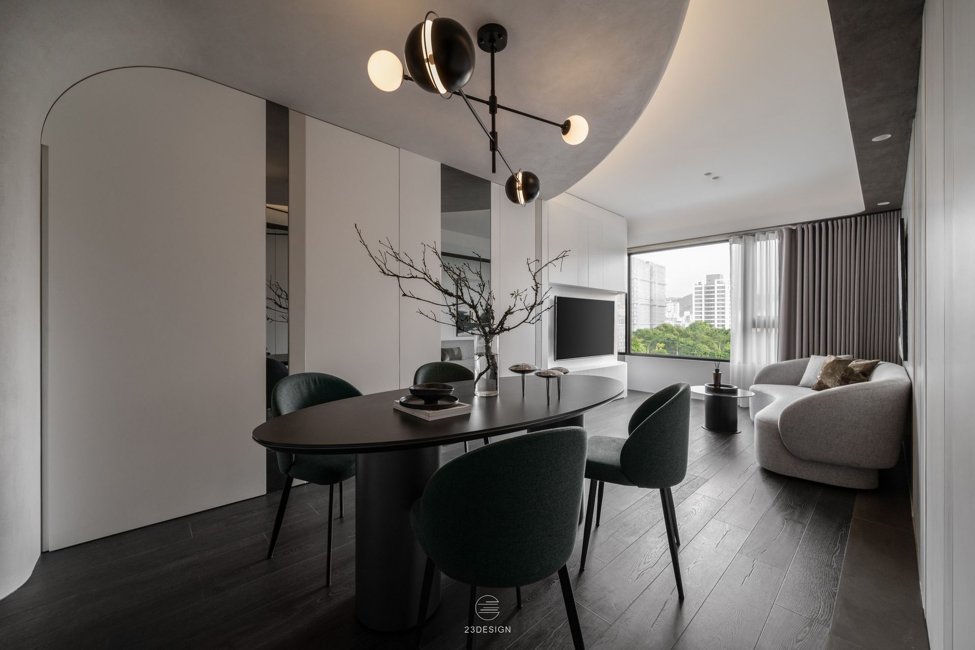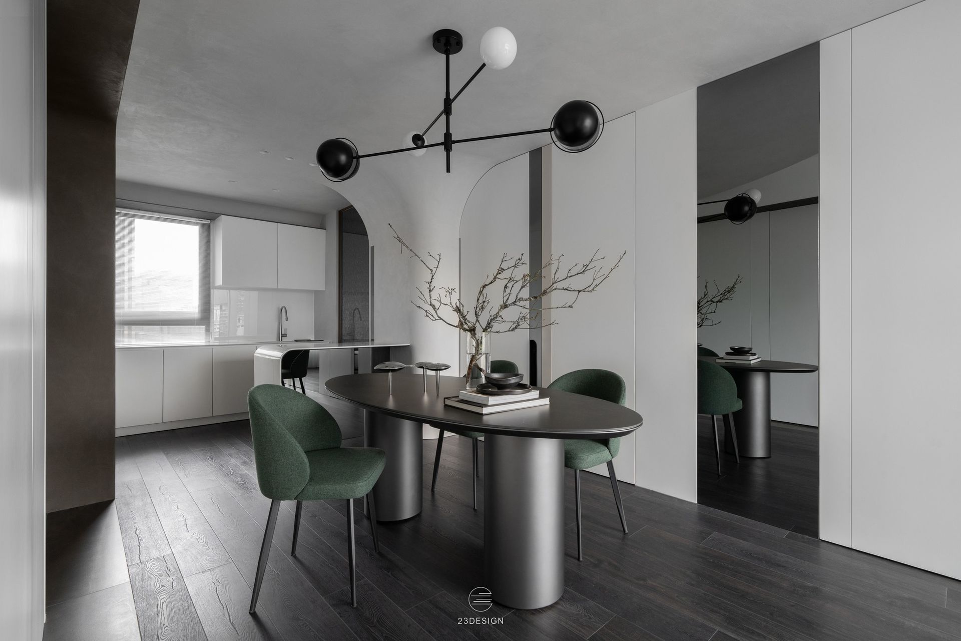 餐廳中一張橢圓形薄磚餐桌成為視覺焦點,金屬噴漆的腳座更顯質感,搭配墨綠色布面餐椅,營造出舒適宜人的用餐環境。