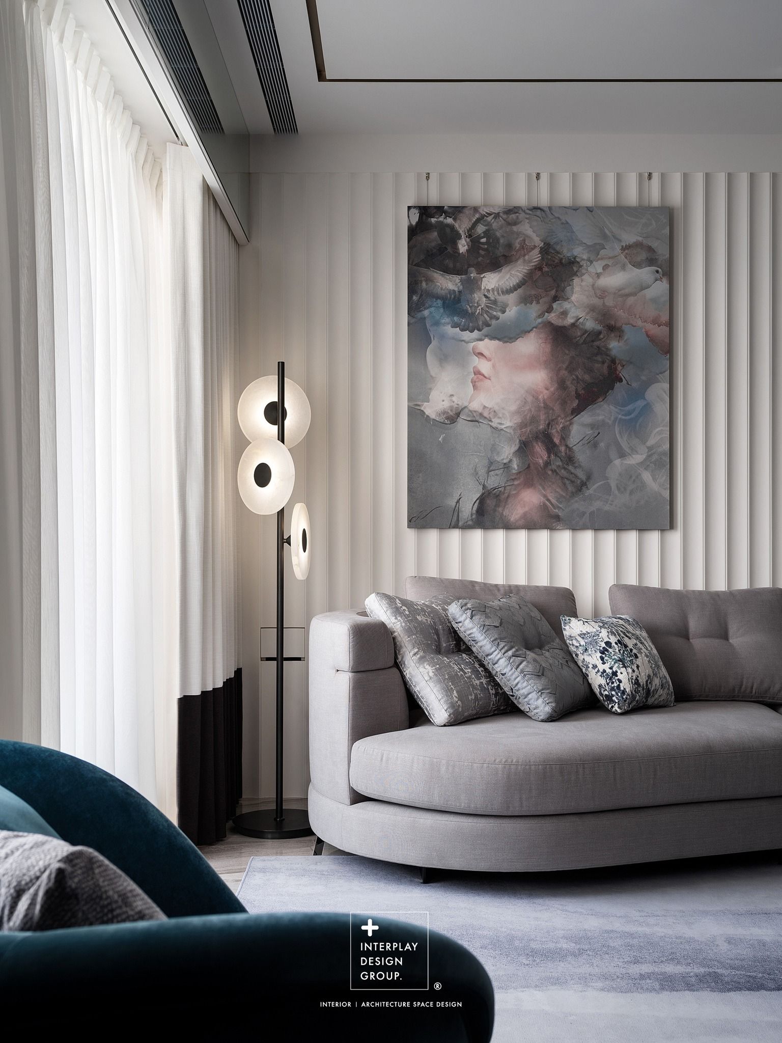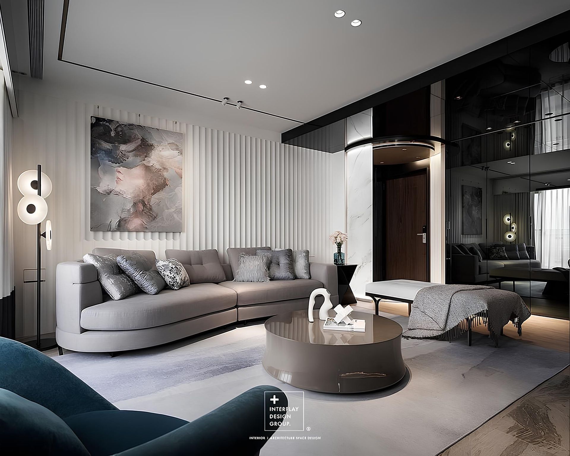 客廳淺灰色布沙發坐感軟Q舒適,藍色絨布單椅注入一抹獨特的亮點,搭配實木皮亮面噴漆茶几,展現出質感與品味。