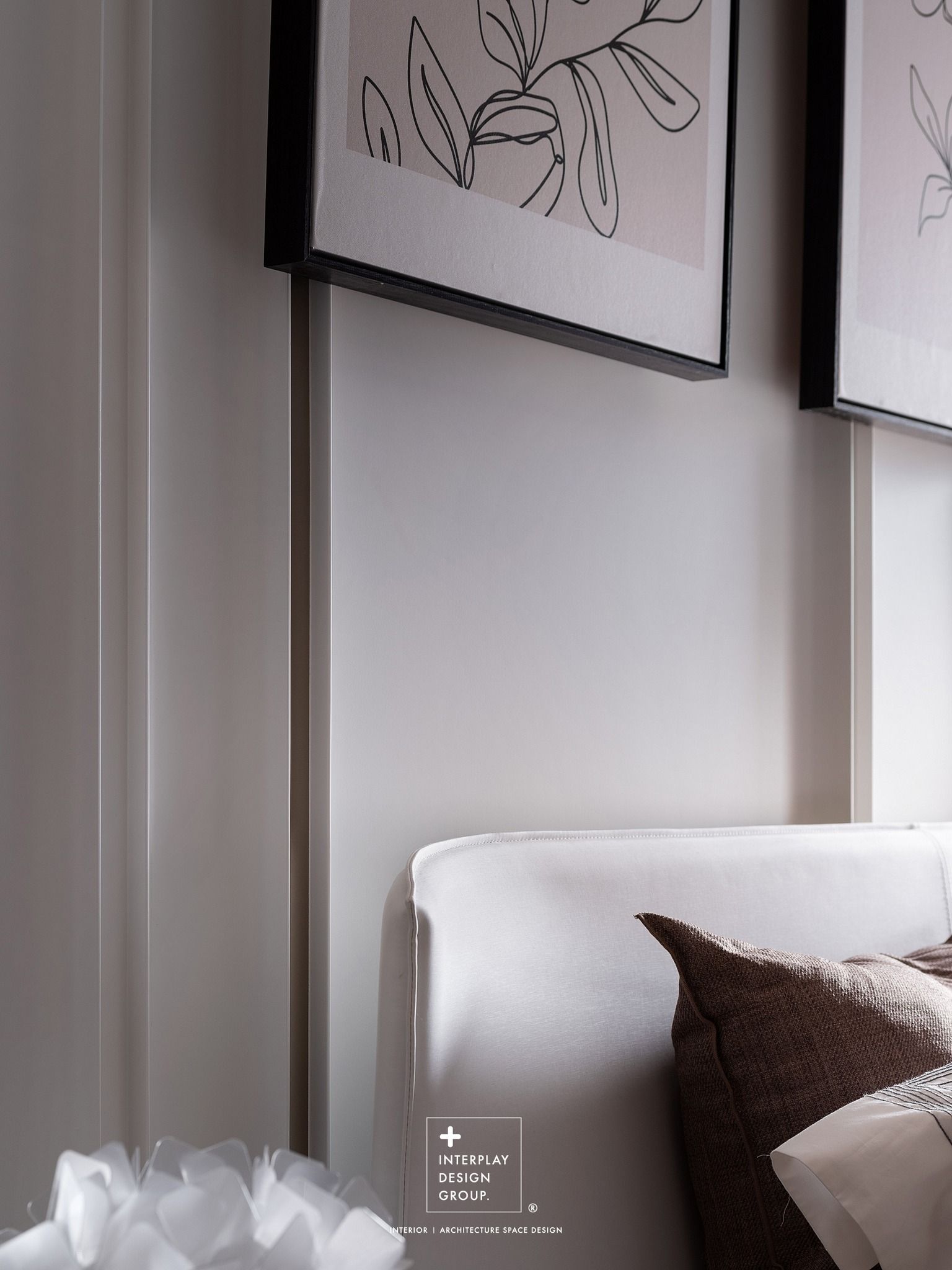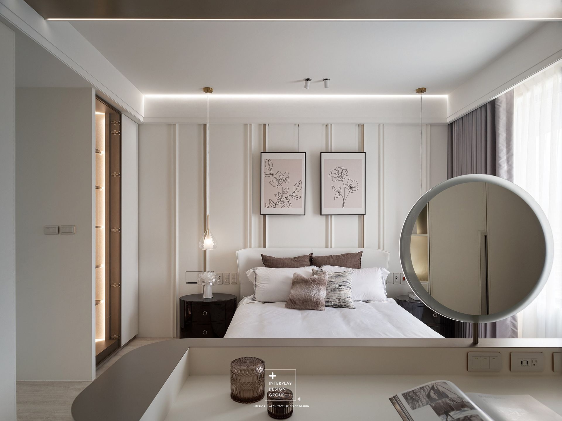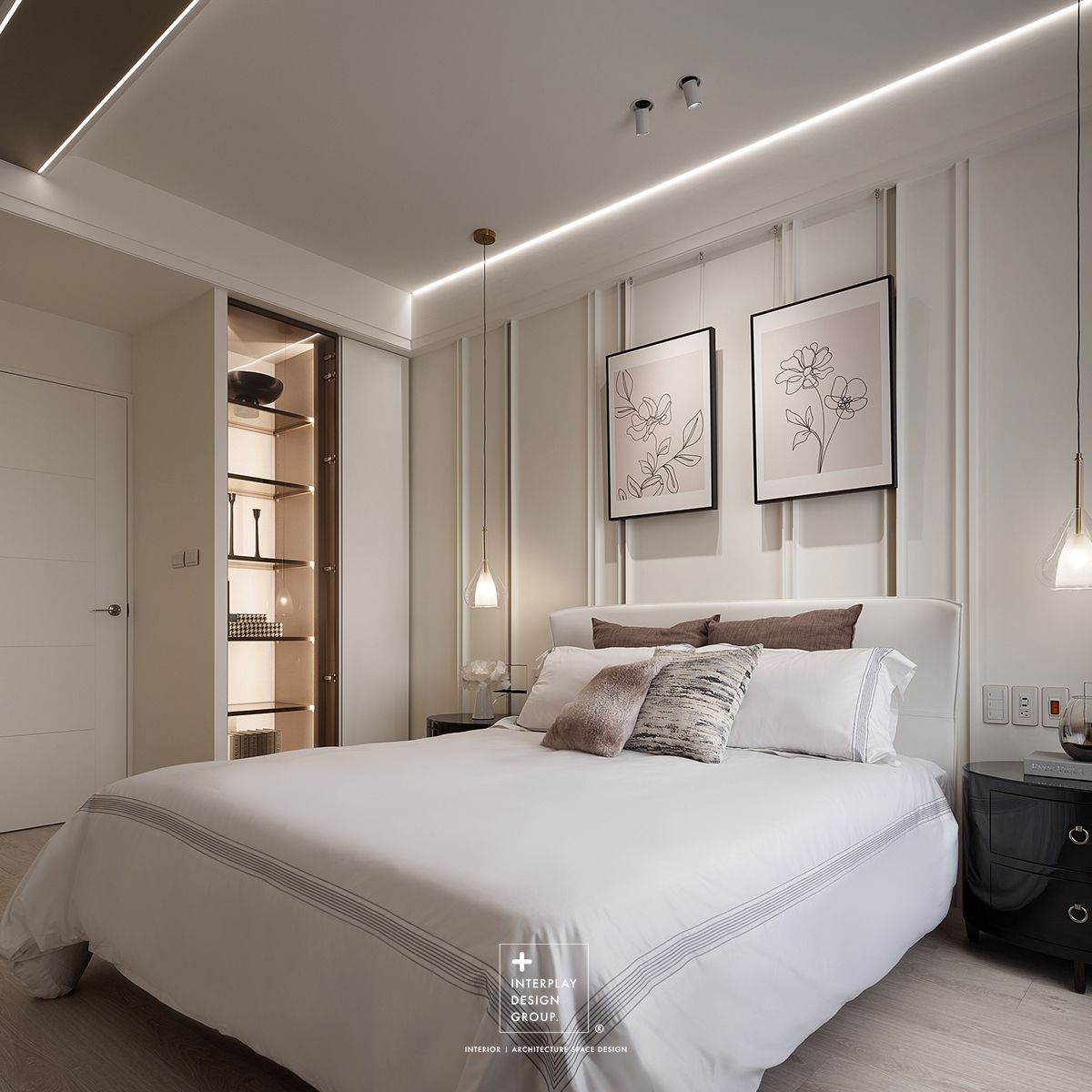 私領域空間運用簡約的線板點綴,搭配白色皮革床架與實木皮亮面床頭櫃,烘托溫雅舒適的睡眠區,享受小豪宅般的細膩奢美。