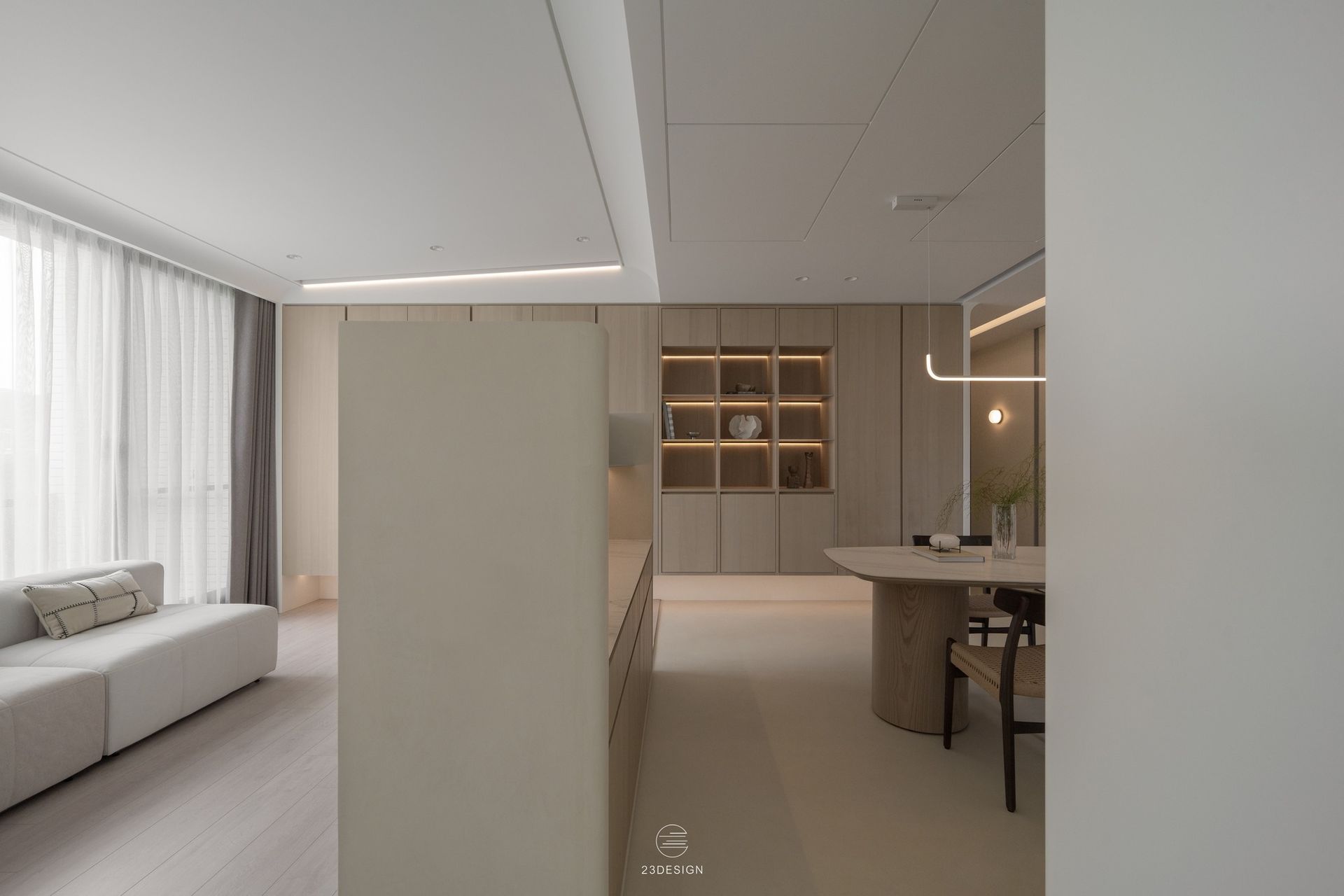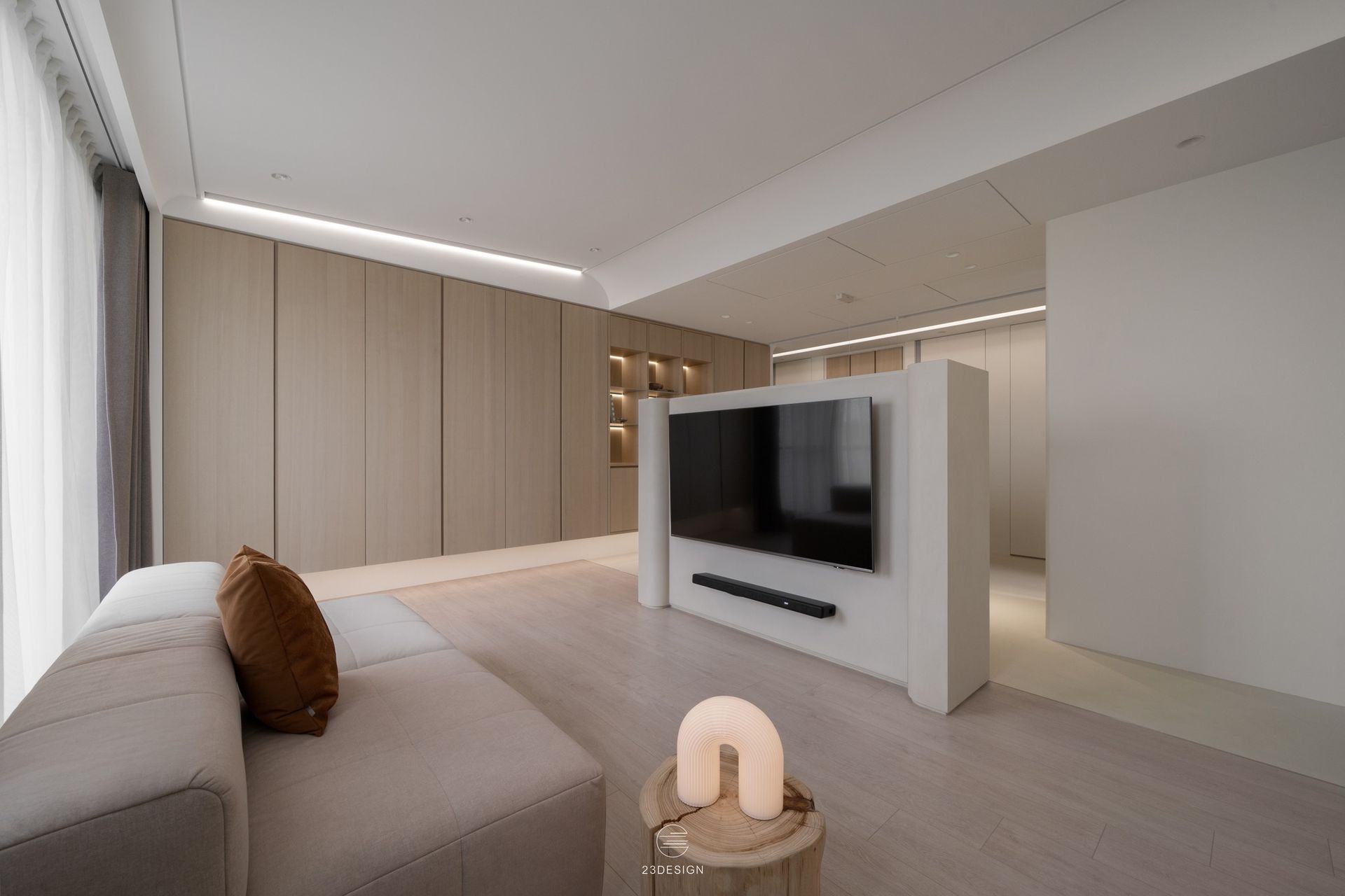 客廳柔米色的沙發以跳色布面靜靜佇立,低調卻又展現層次,旁側搭配的日本檜木邊几散發淡淡木香,仿佛森林的一角被留存於室內,讓呼吸都變得沉穩安定。