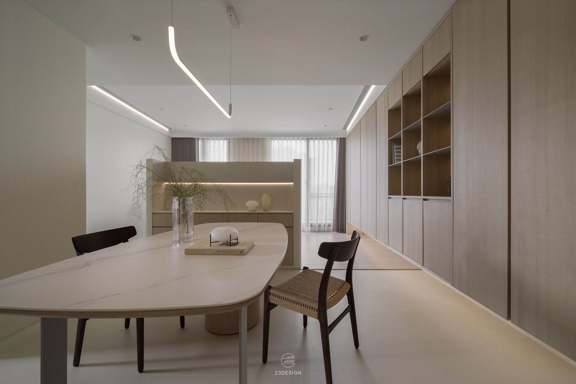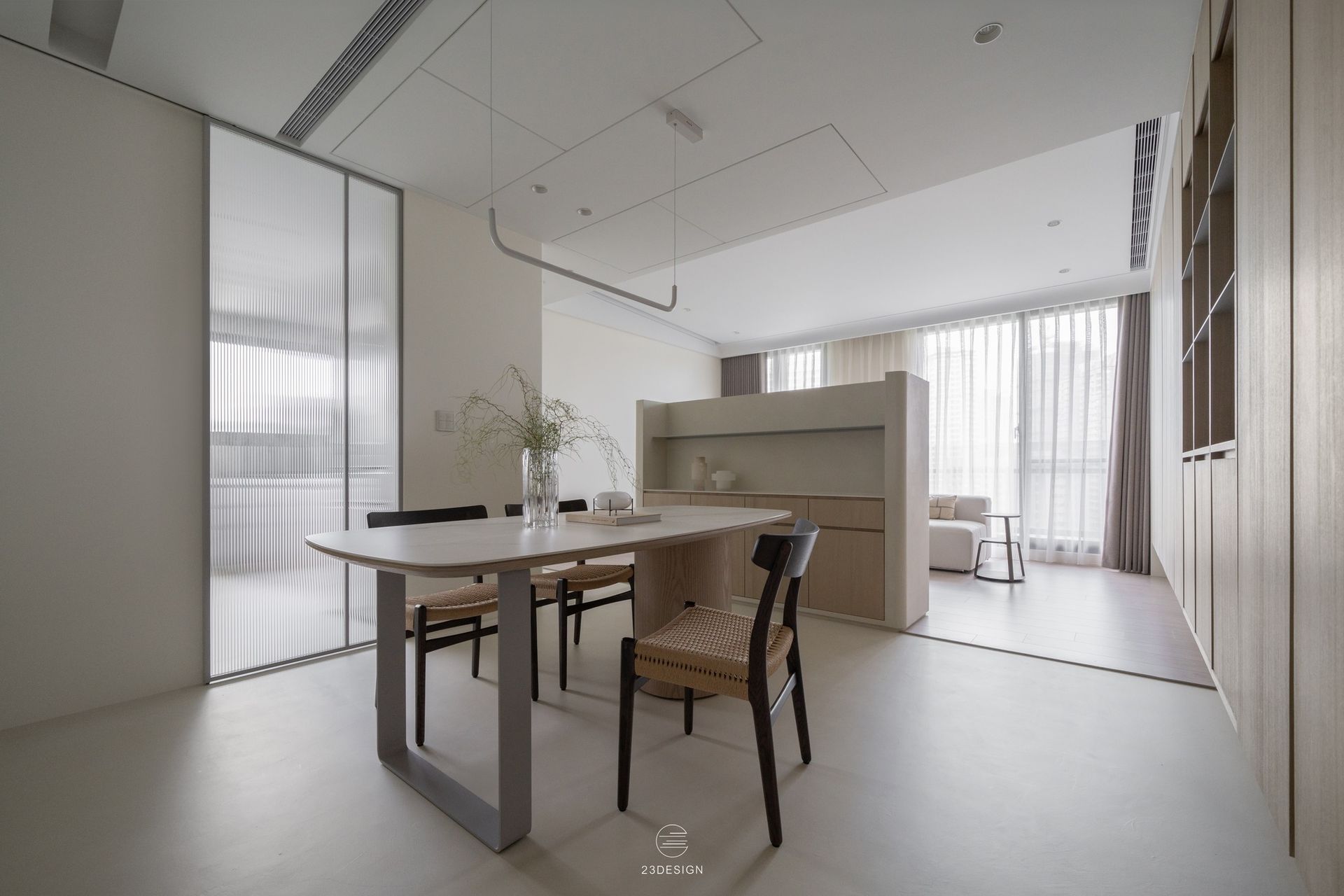 餐廳以西班牙銀狐陶板鋪陳不規則船型桌面,搭配一側黑鐵噴漆、另一側原木質感的桌腳,在不對稱中取得平衡,搭配紙纖編織餐椅,讓現代感與手作工藝於餐敘日常中交融。電視牆背櫃延續銀狐陶板語彙,穩穩串連起場域節奏。