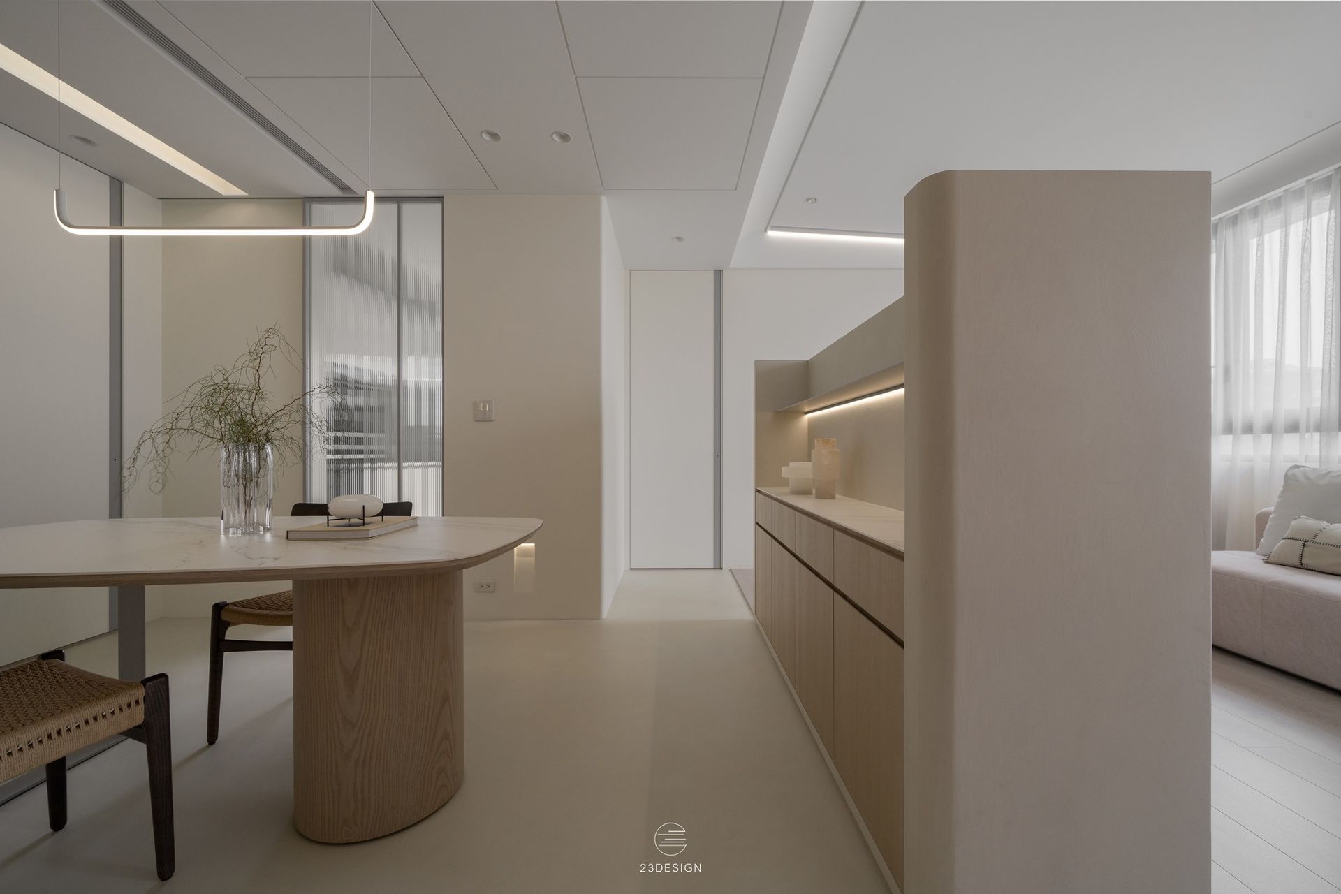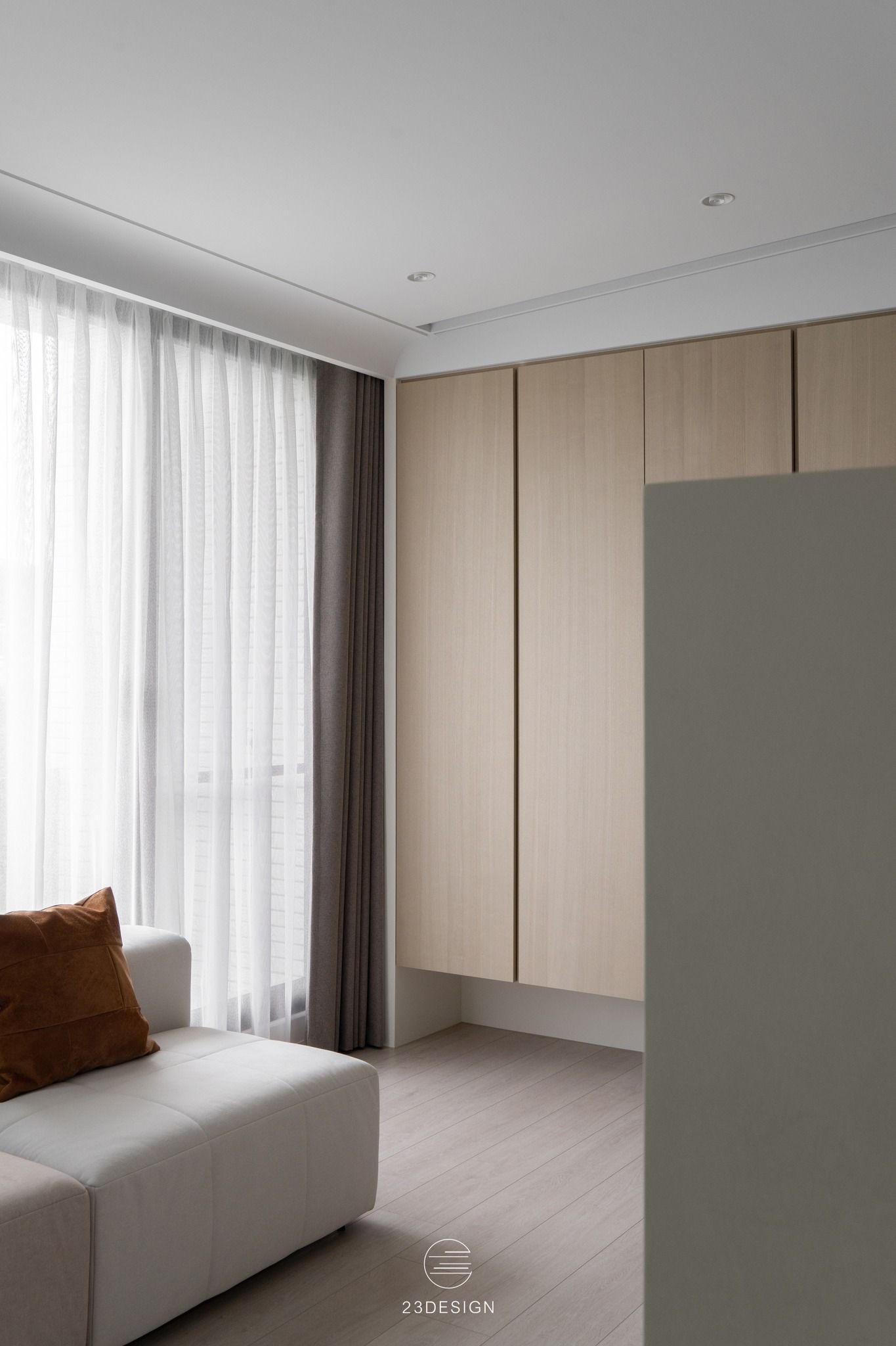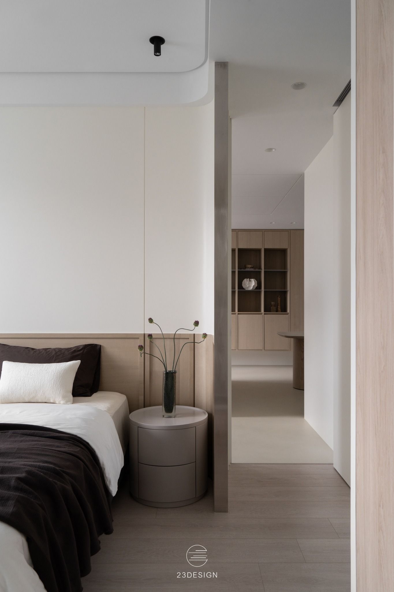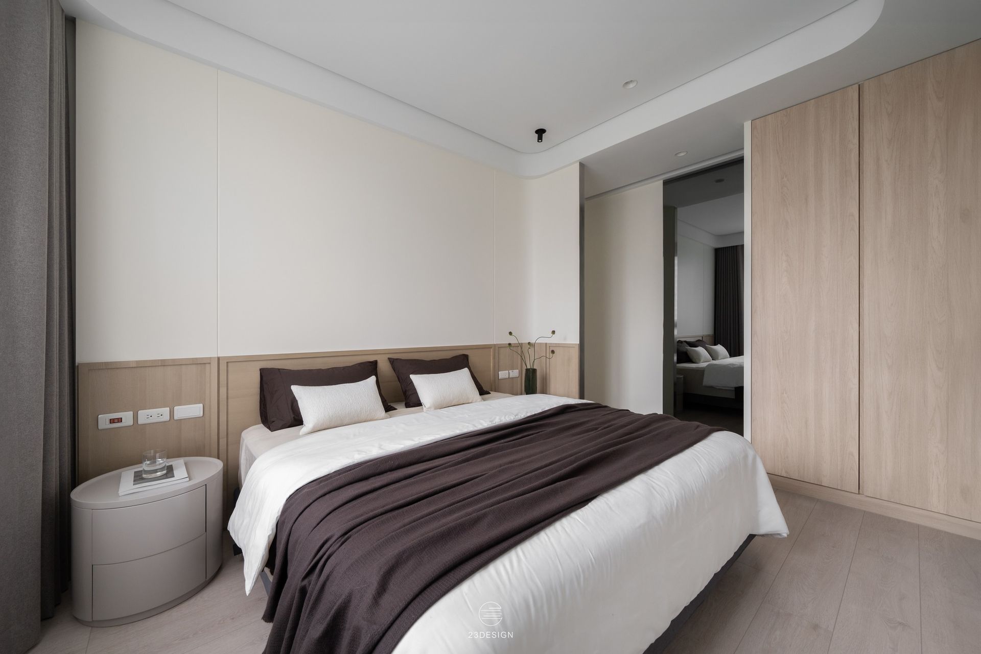 臥室延續著一貫的柔和語調,床底以布面包覆,簡潔而厚實,與珍珠灰烤漆的床頭櫃並肩而立,圓潤的造型妥善收納生活的點滴,也保留了空間的靜謐與溫柔。