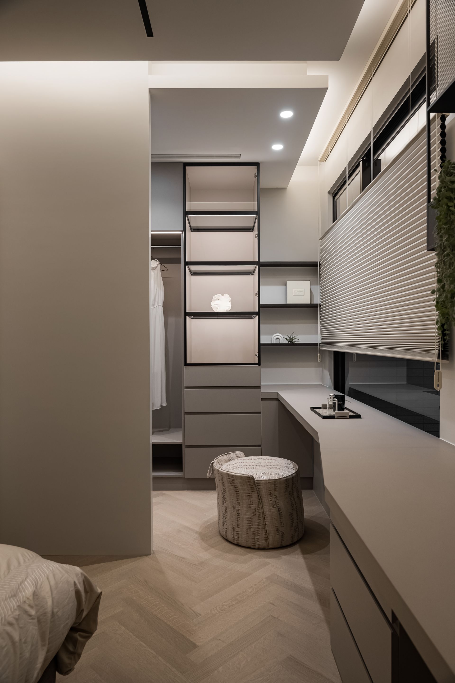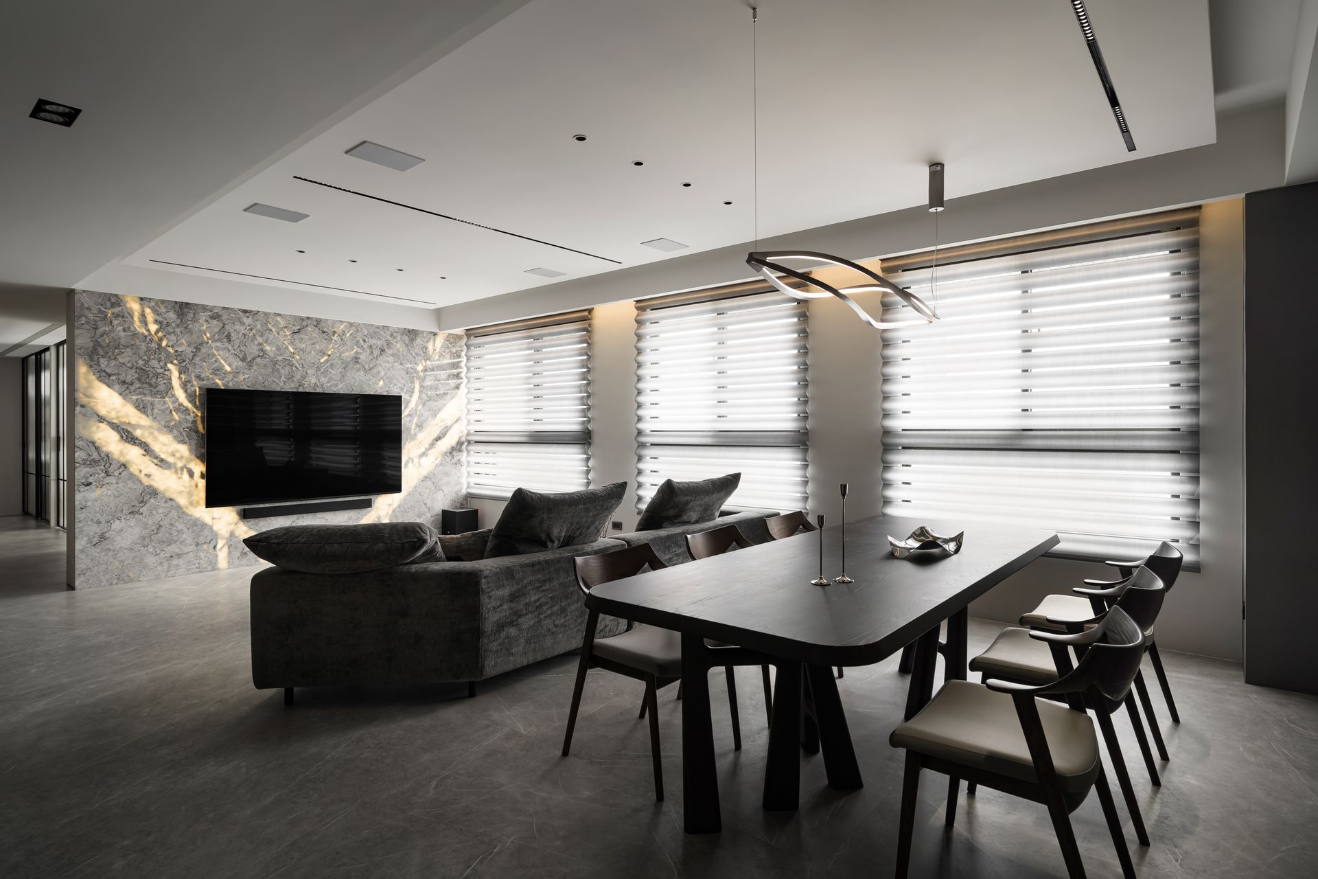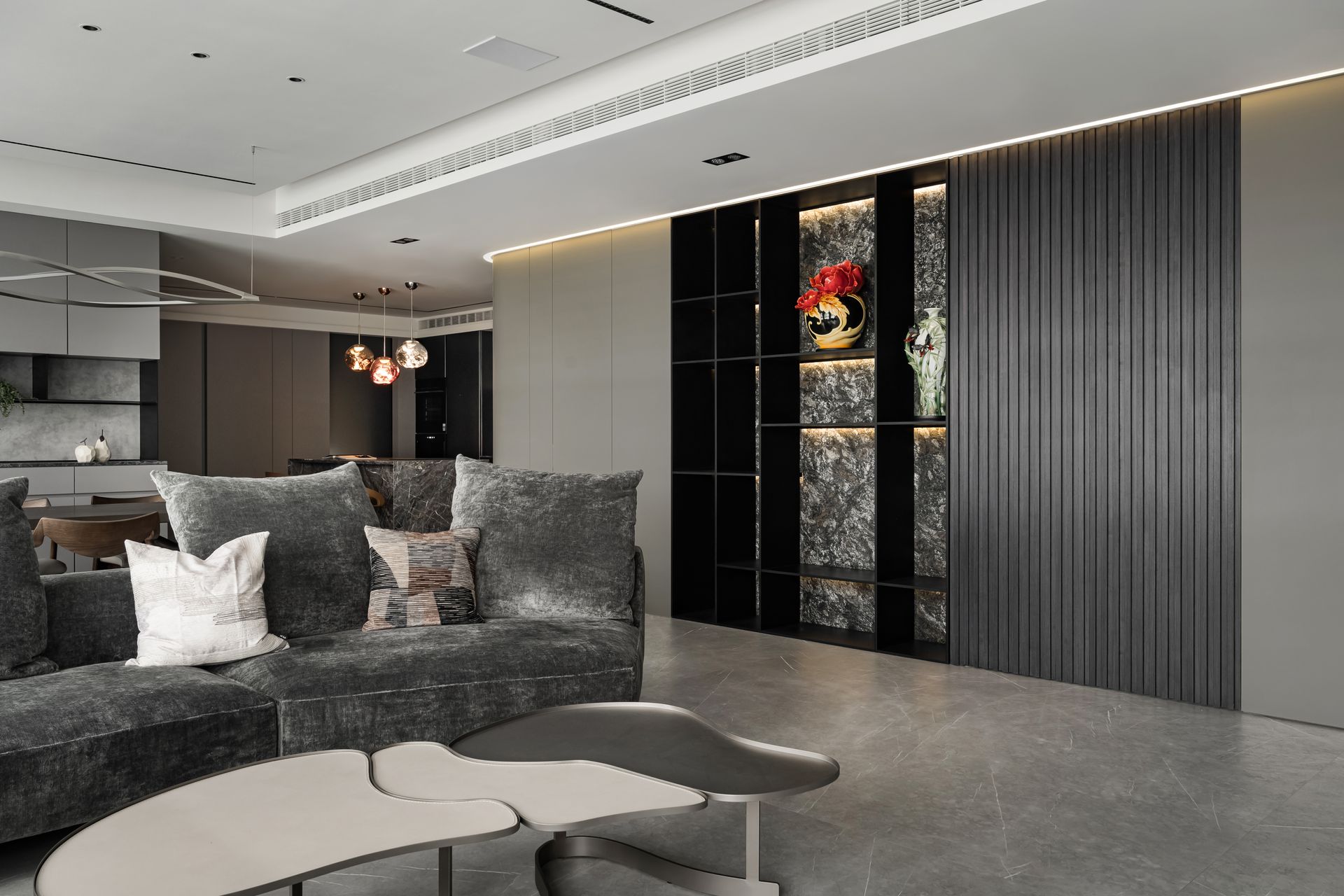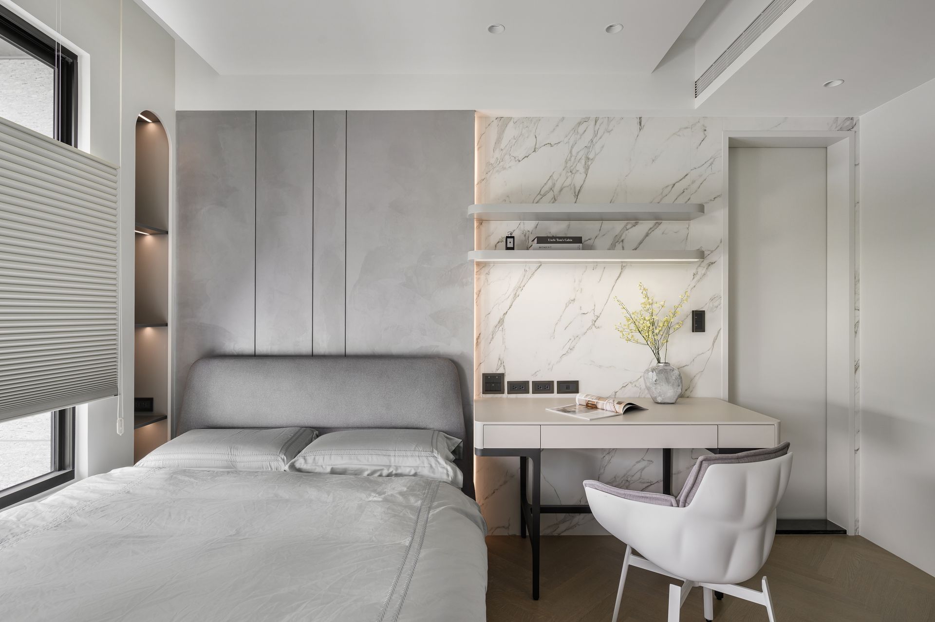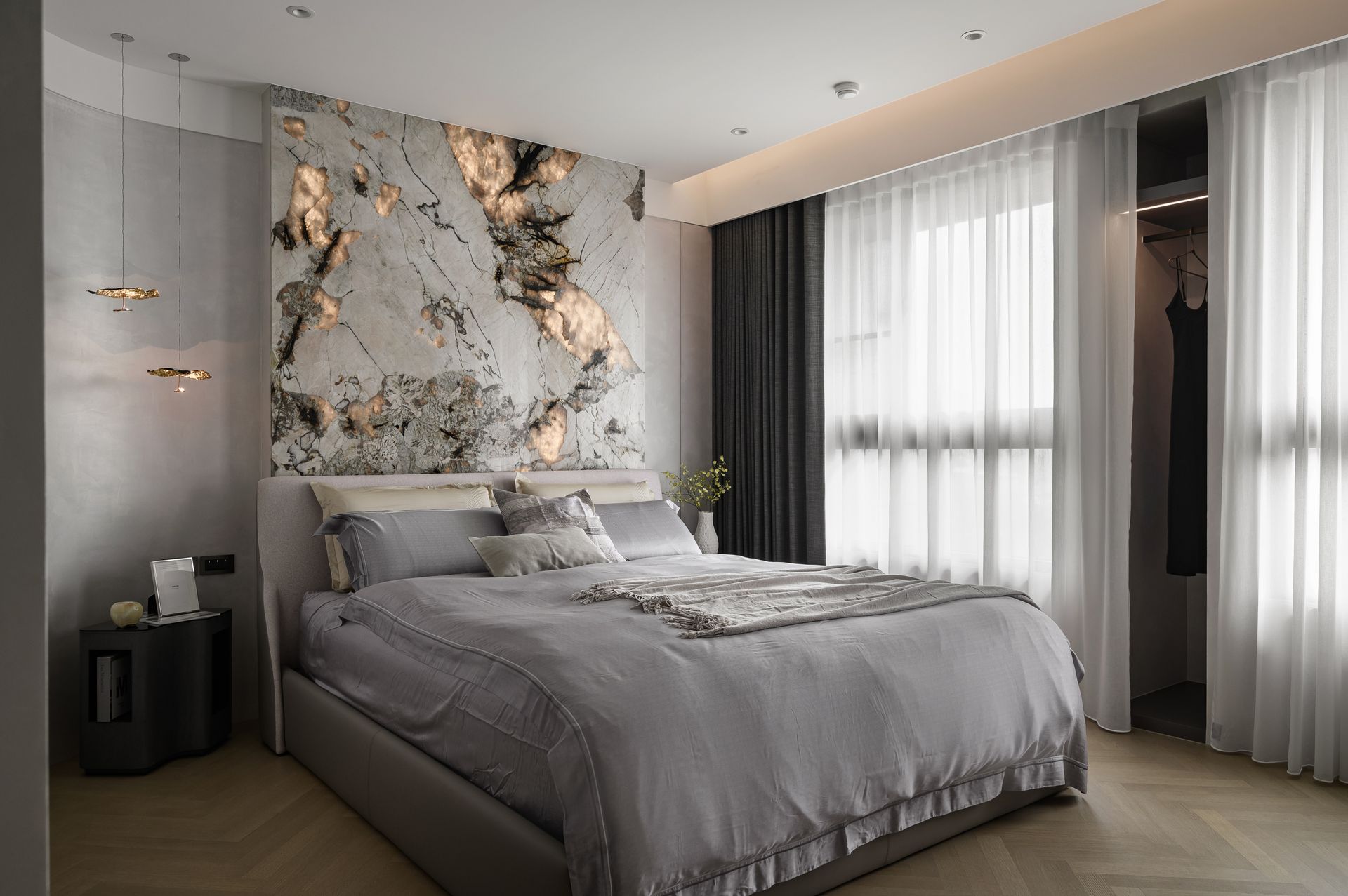 臥室延續低飽和度灰色系,背牆選用天然紋理大理石,透過燈光點綴,彷彿流動的藝術畫作,塑造出既具設計感又充滿舒適感的空間。