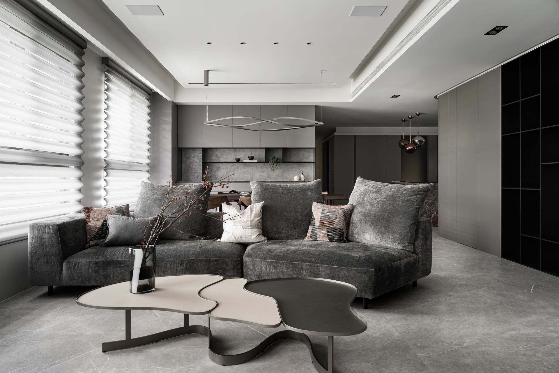 進入客廳,視線不禁被深灰色絨面沙發吸引,寬敞的座面和自由凹折的靠墊設計,完美迎合不同的坐姿需求,搭配鐵件與馬鞍皮交織的流線型茶几,構築出不規則的層次感。