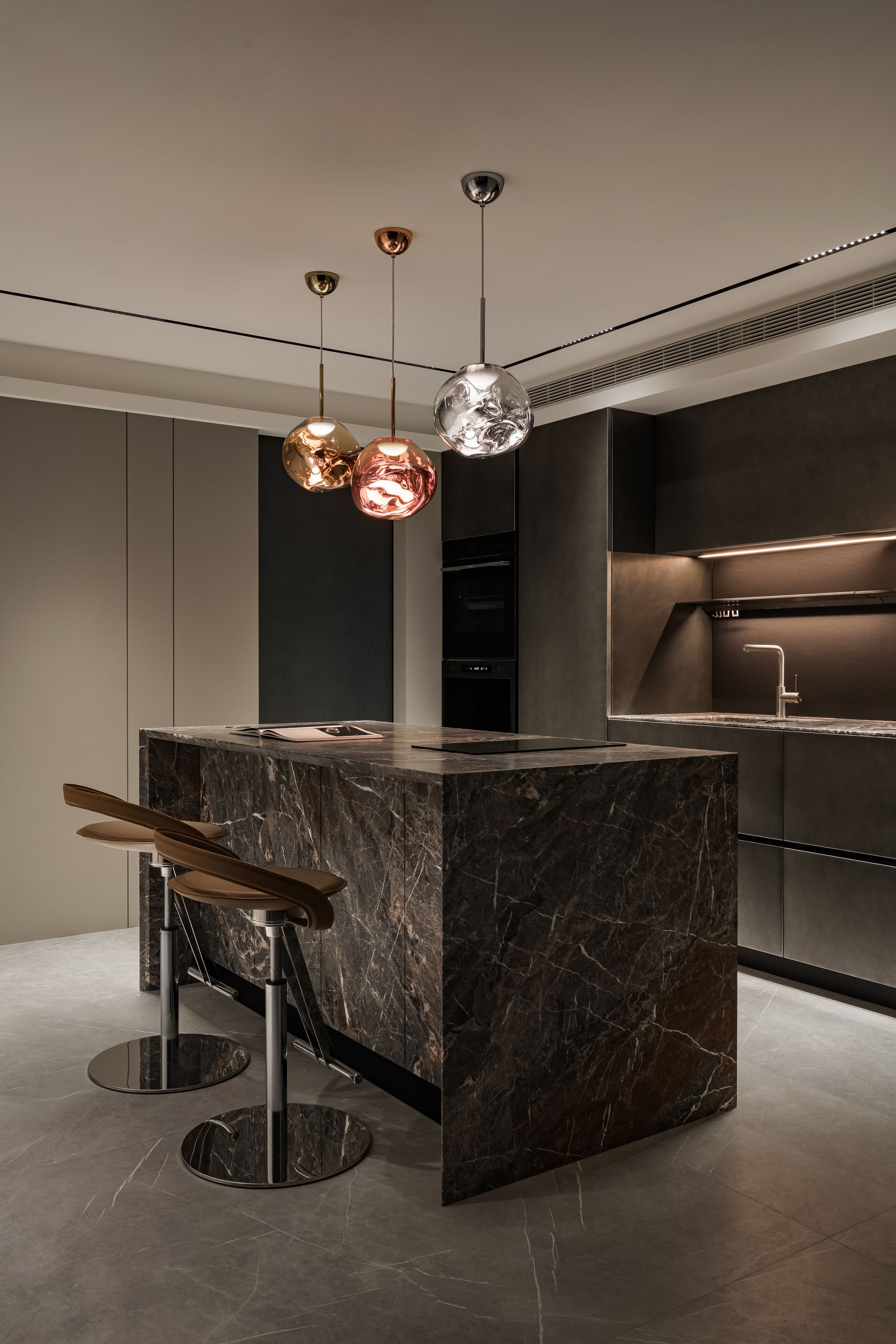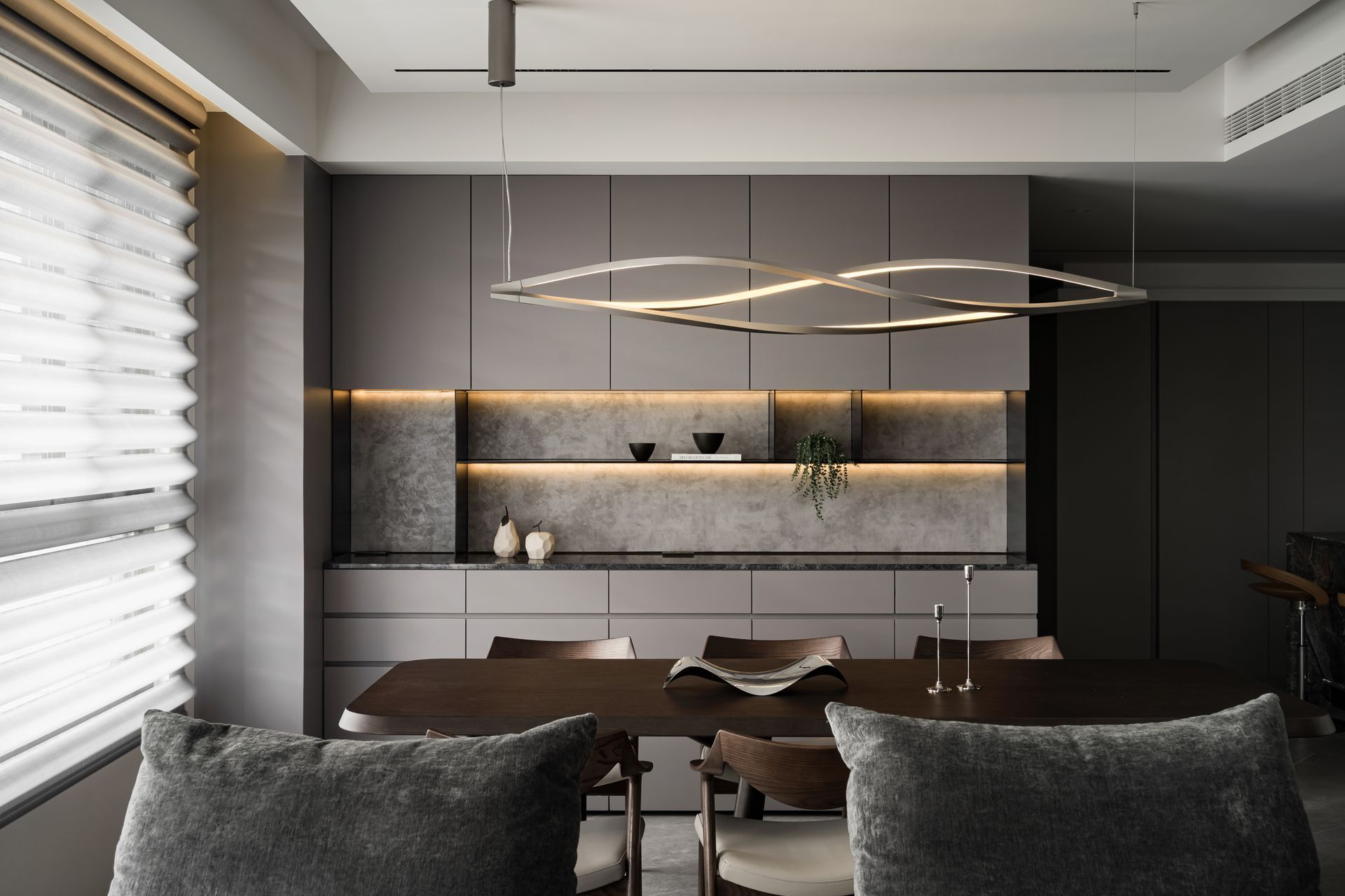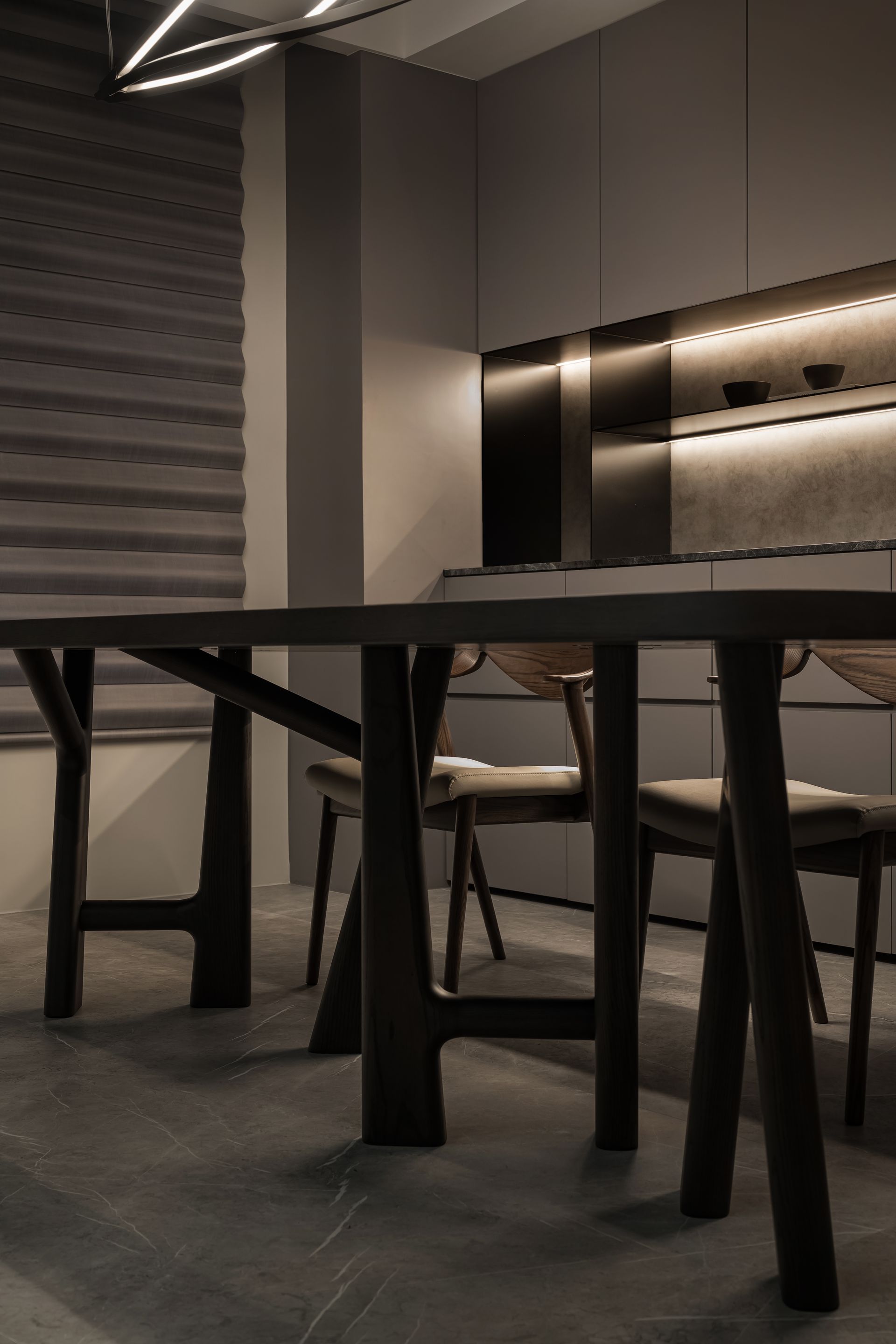 餐廳以深色木質餐桌為空間核心,設計靈感源自自然界的有機生態,其桌腳設計如同大地滋養出的樹幹般直竄而起,充滿原始而獨特的藝術美感,將大自然的生命力帶入到日常生活空間。