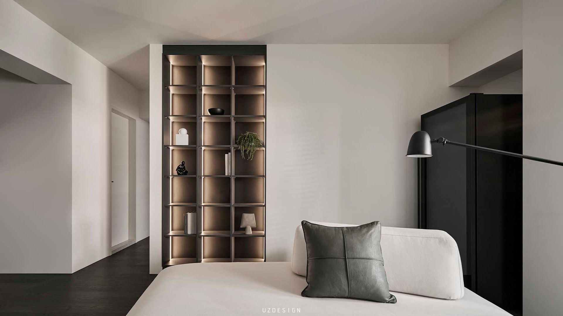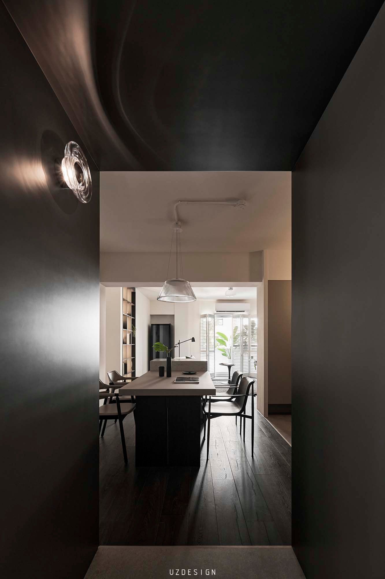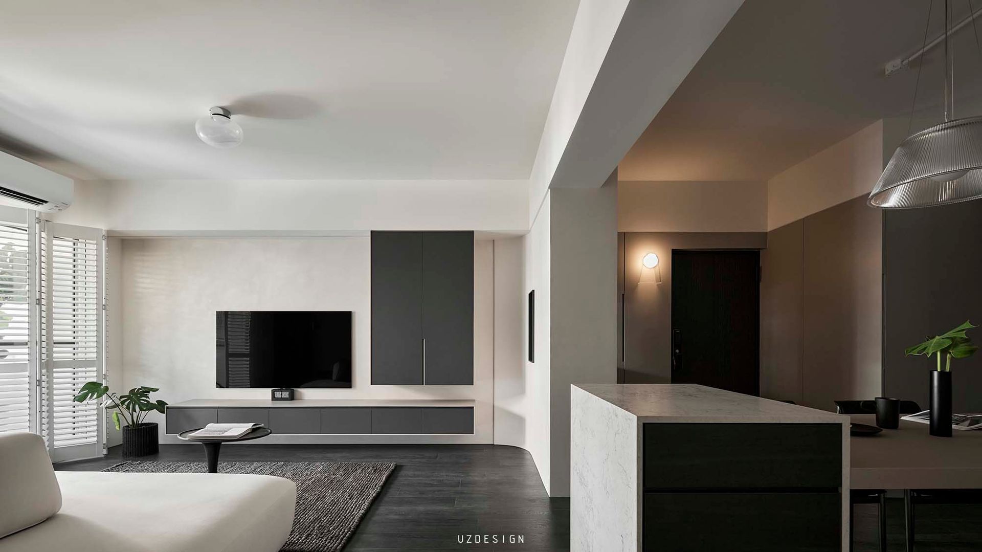 客廳主沙發的線條低調而寬闊,活動式靠墊隨生活移動,柔軟中保留支撐,讓坐、躺、靠之間沒有刻意的界線,搭配在一旁的木質邊几以溫潤的材質平衡空間的深色基調,承接書本、茶杯,與時間暫時停下的瞬間。