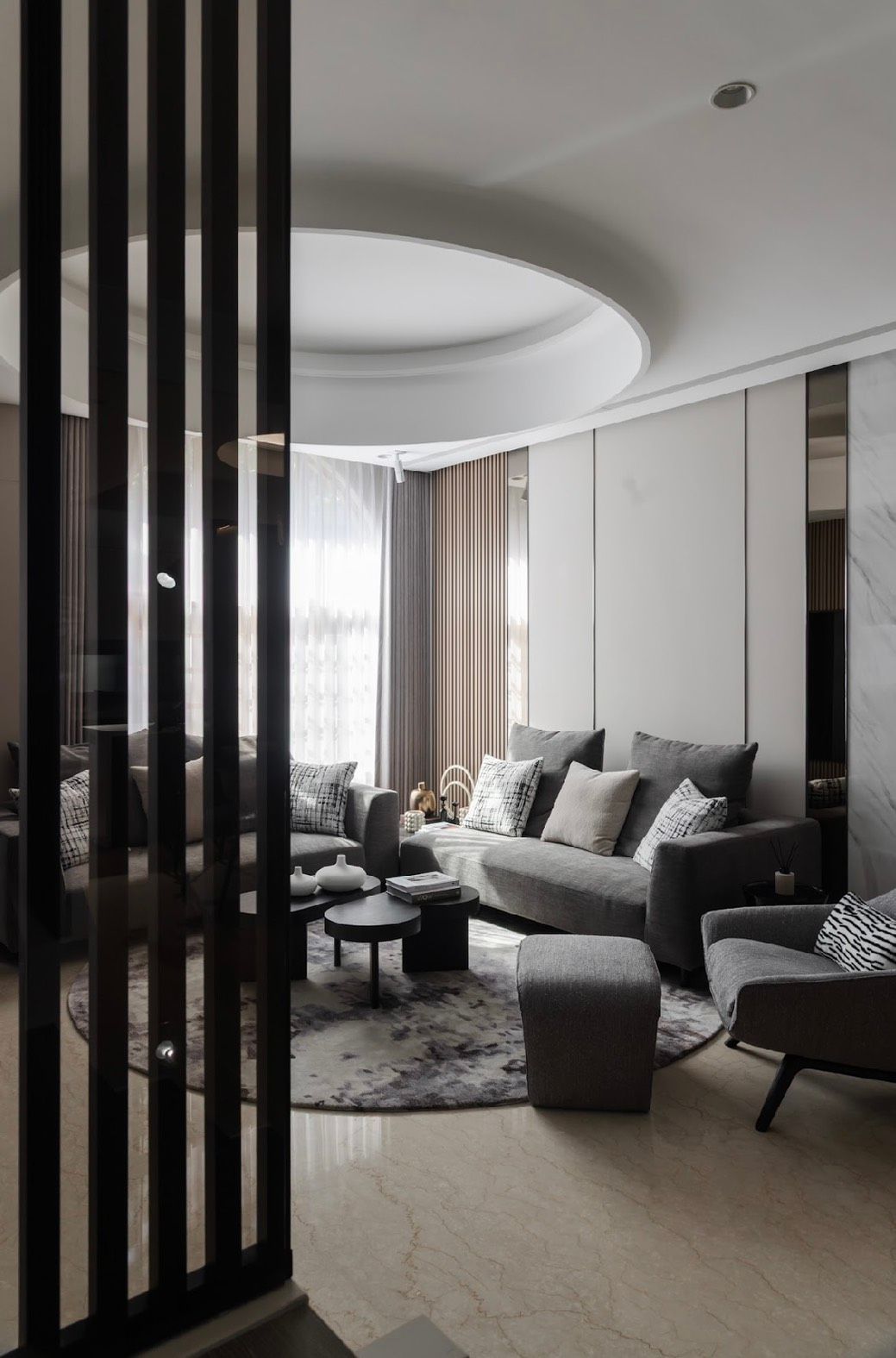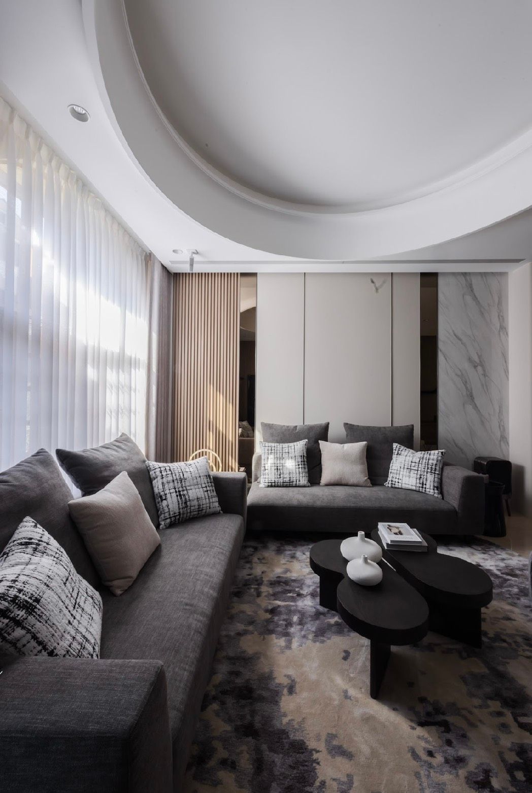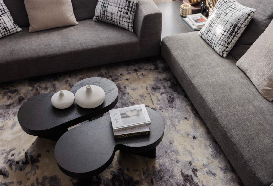 茶几以不對稱比例打破制式軸線,可分開或錯位使用,在維持視覺秩序的同時保留空間彈性,下方薄抽屜設計,讓收納機能自然隱藏於生活之中,圓形地毯界定客廳核心範圍,柔化石材地坪的冷冽質感,為大量硬質材料之間加入必要的緩衝層。