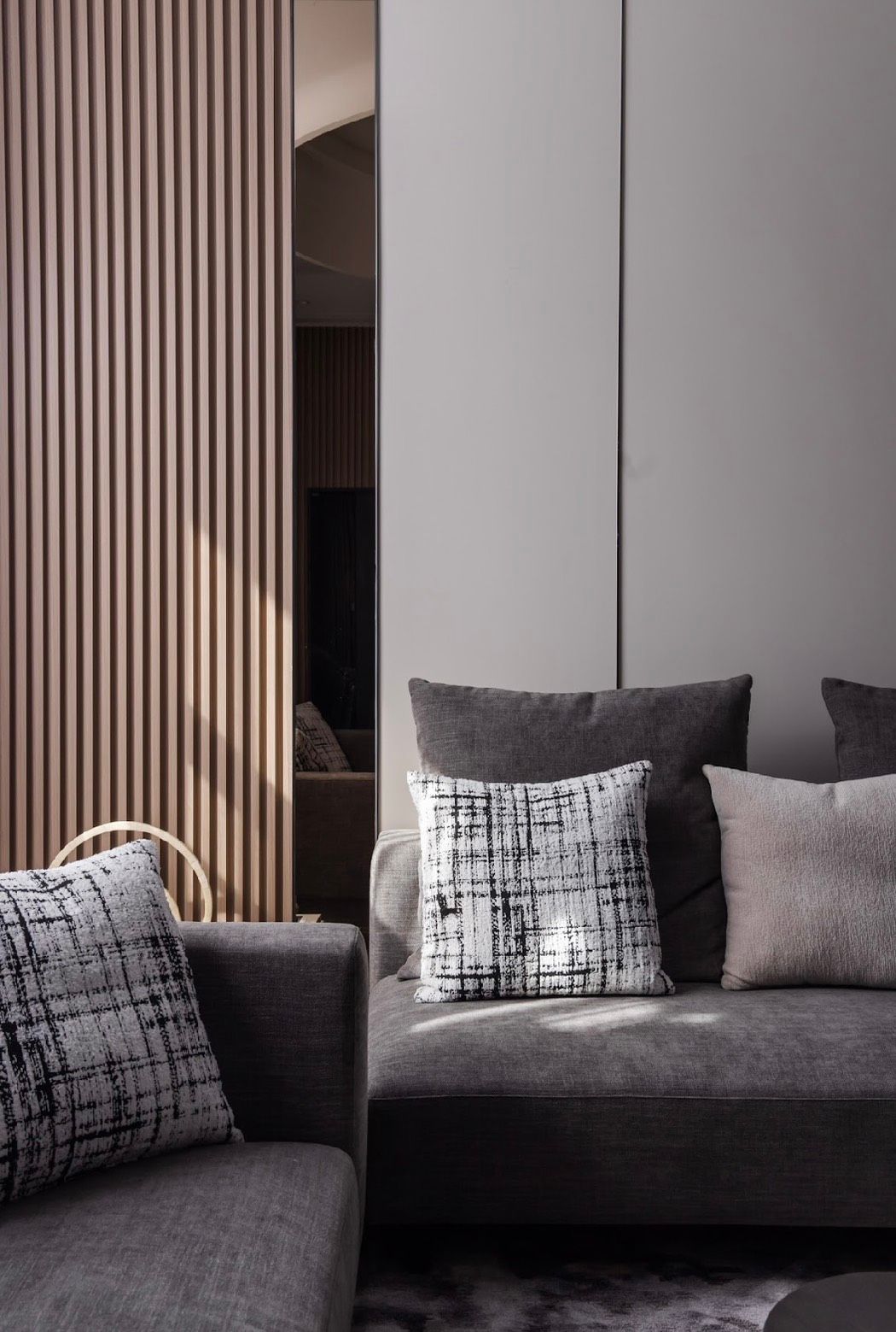 灰階在空間中層層展開,柔和的光自上而下滲入,