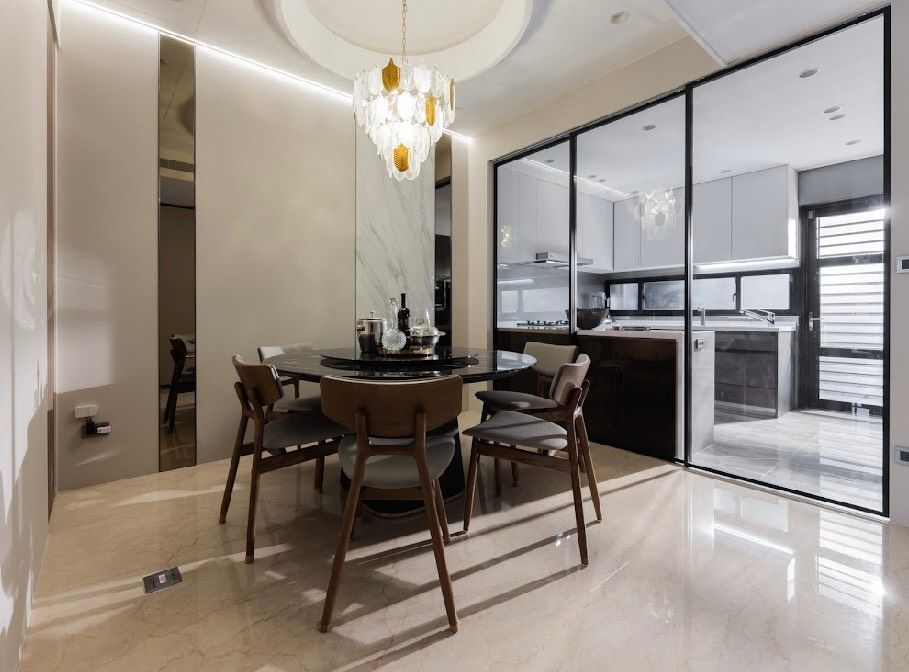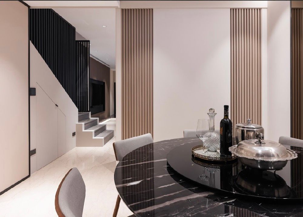 餐廳以圓形餐桌為中心,拉近用餐關係,結合石材桌板與旋轉轉盤,在機能與比例之間取得平衡,讓用餐回歸自然且有儀式感的日常。
