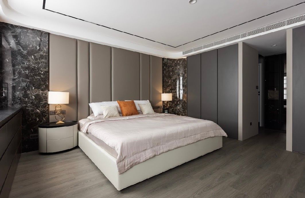 臥室臥室家具則回歸安定,低背床架與內下崁結構,讓視覺重心降低,營造沉靜的睡眠氛圍,床頭櫃以簡潔比例搭配實用收納,維持整體空間的純粹與一致。