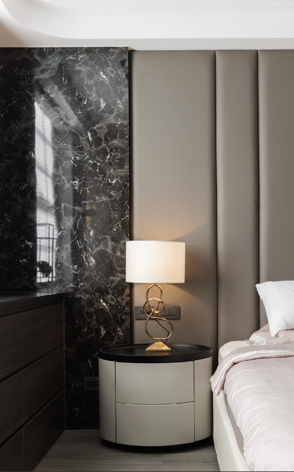 織品的霧面質地吸收光線,石材保留重量與靜度,