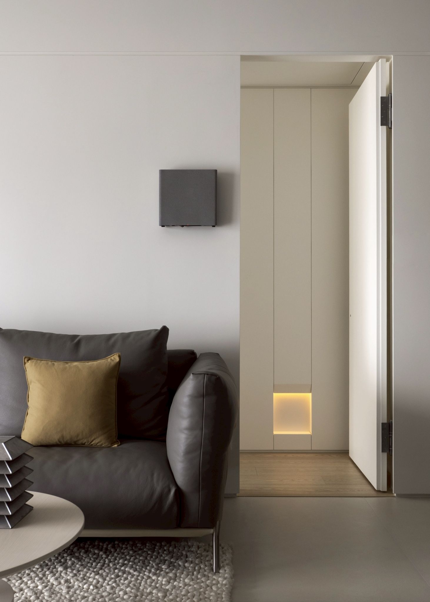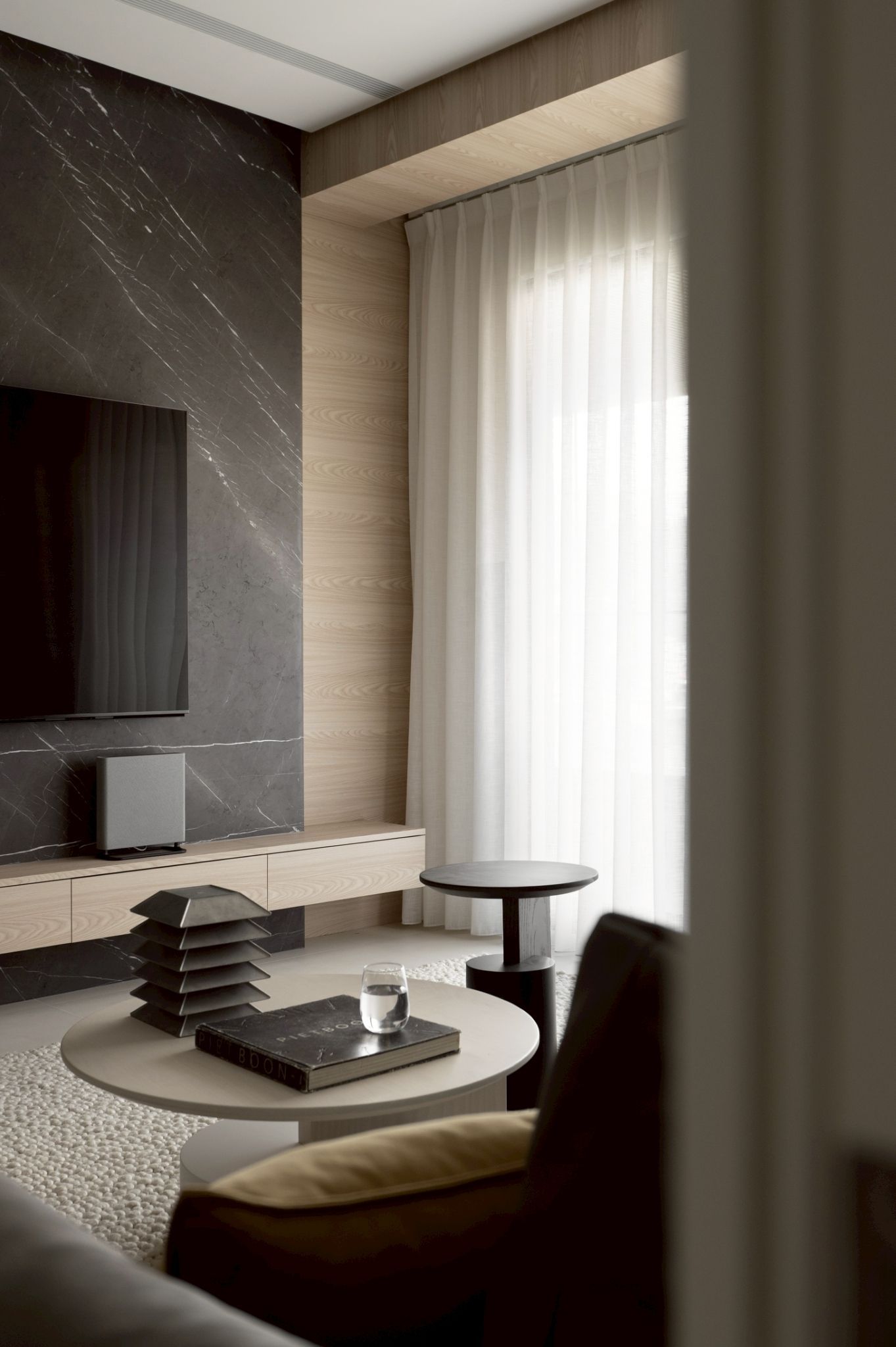 客廳沙發選用義大利進口半苯染牛皮,沉穩灰階搭配跳色底框與金屬腳座,收斂中帶有節奏,大小圓形茶几以實木打造,高低錯落,如同生活的層次,簡單卻不失餘韻。