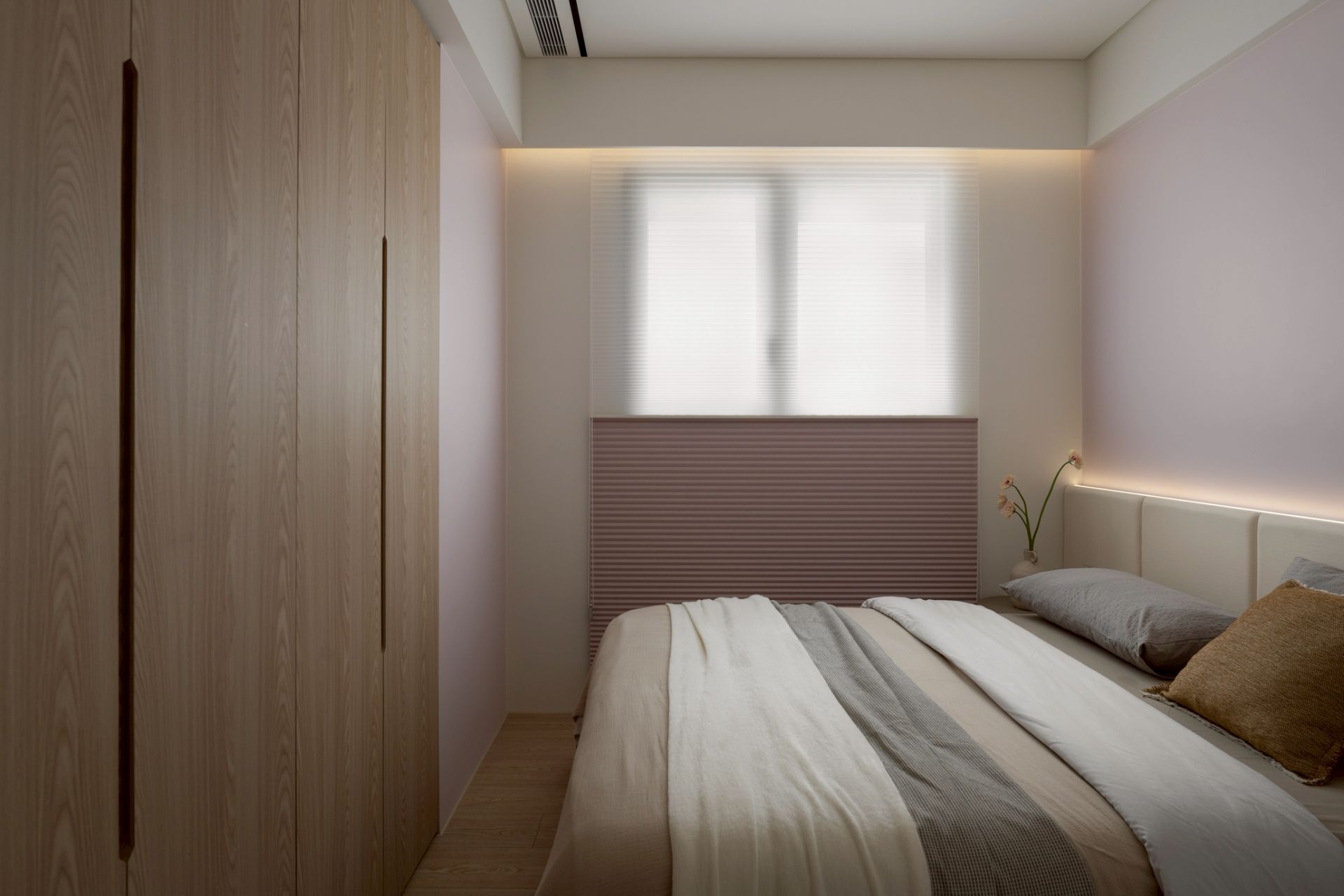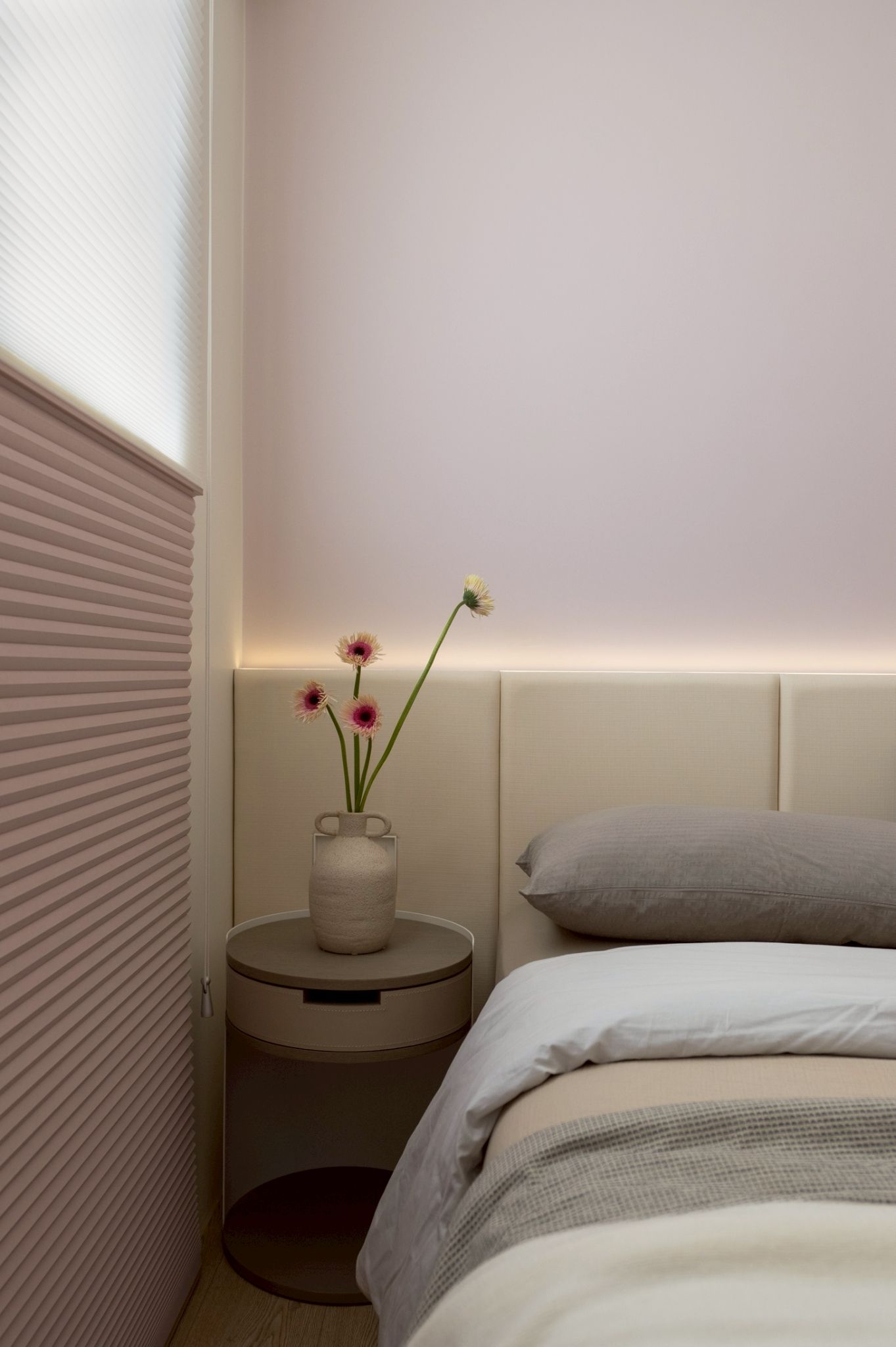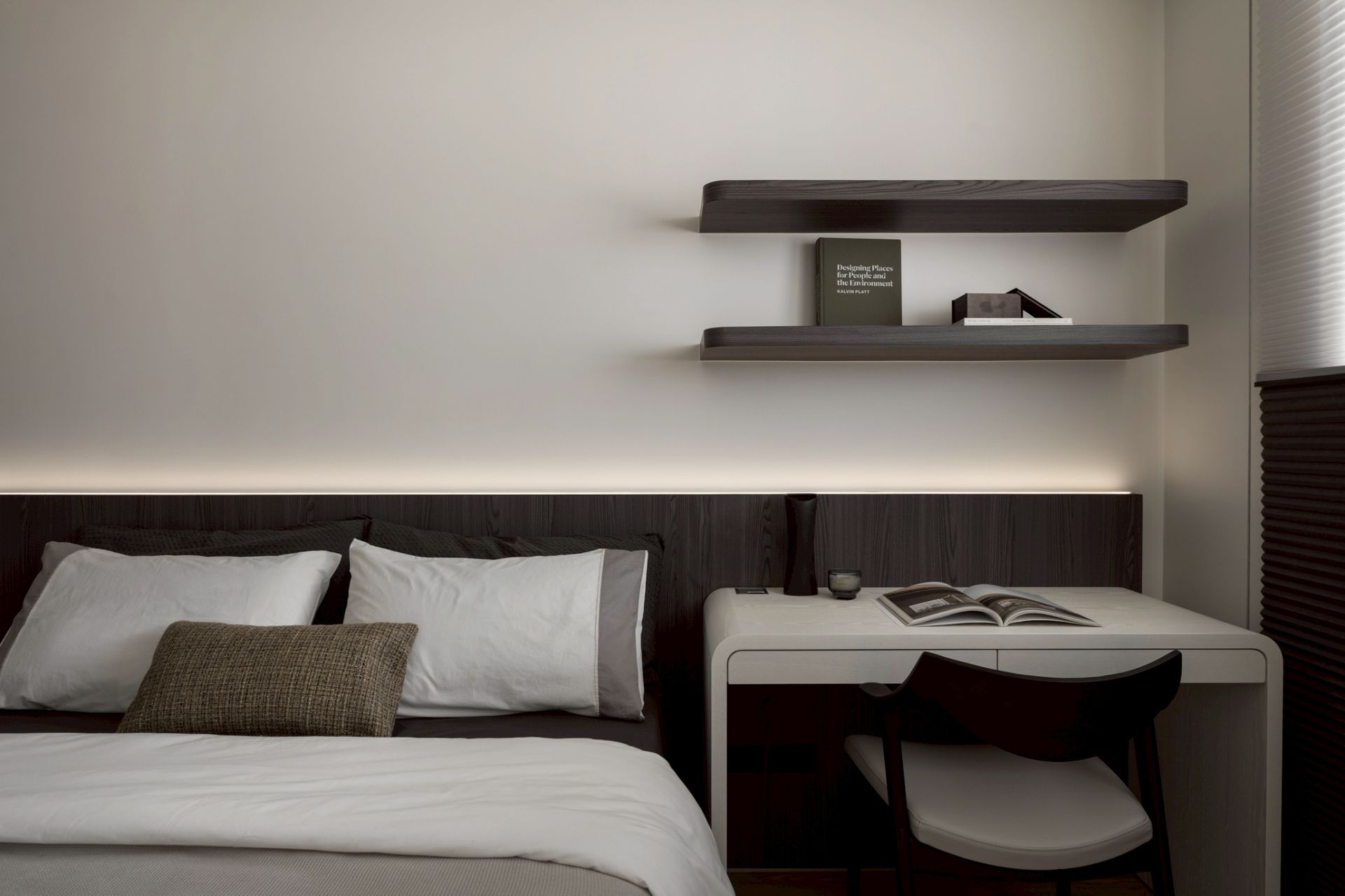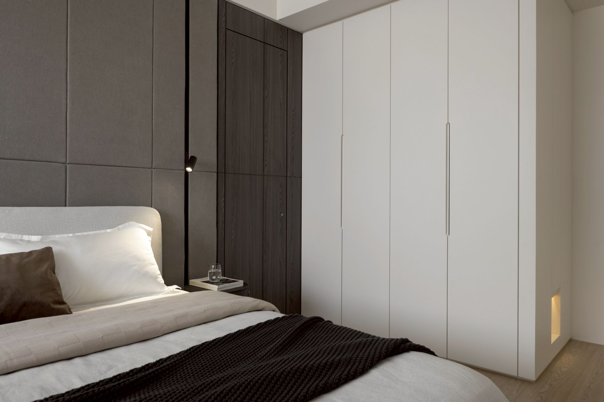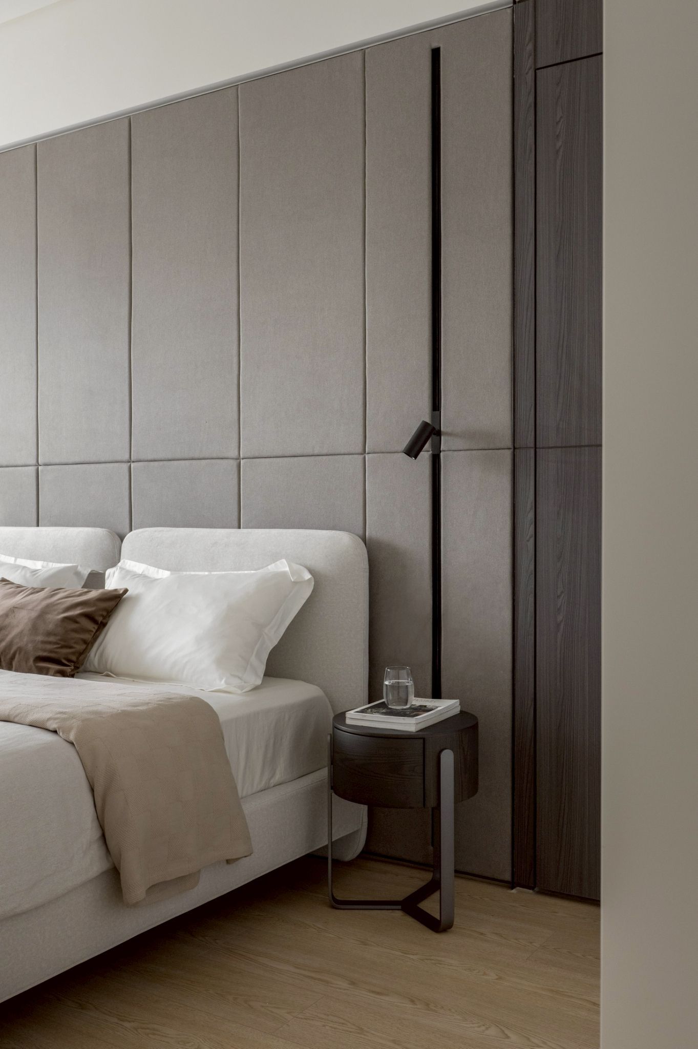 臥室延續整體空間的寧靜基調,以低飽和度布料包覆的床架與床頭櫃為核心,結合簡約實木結構與馬鞍皮細節,沈穩之中蘊藏細膩質地,柔和的輪廓包覆著夜晚的靜謐。