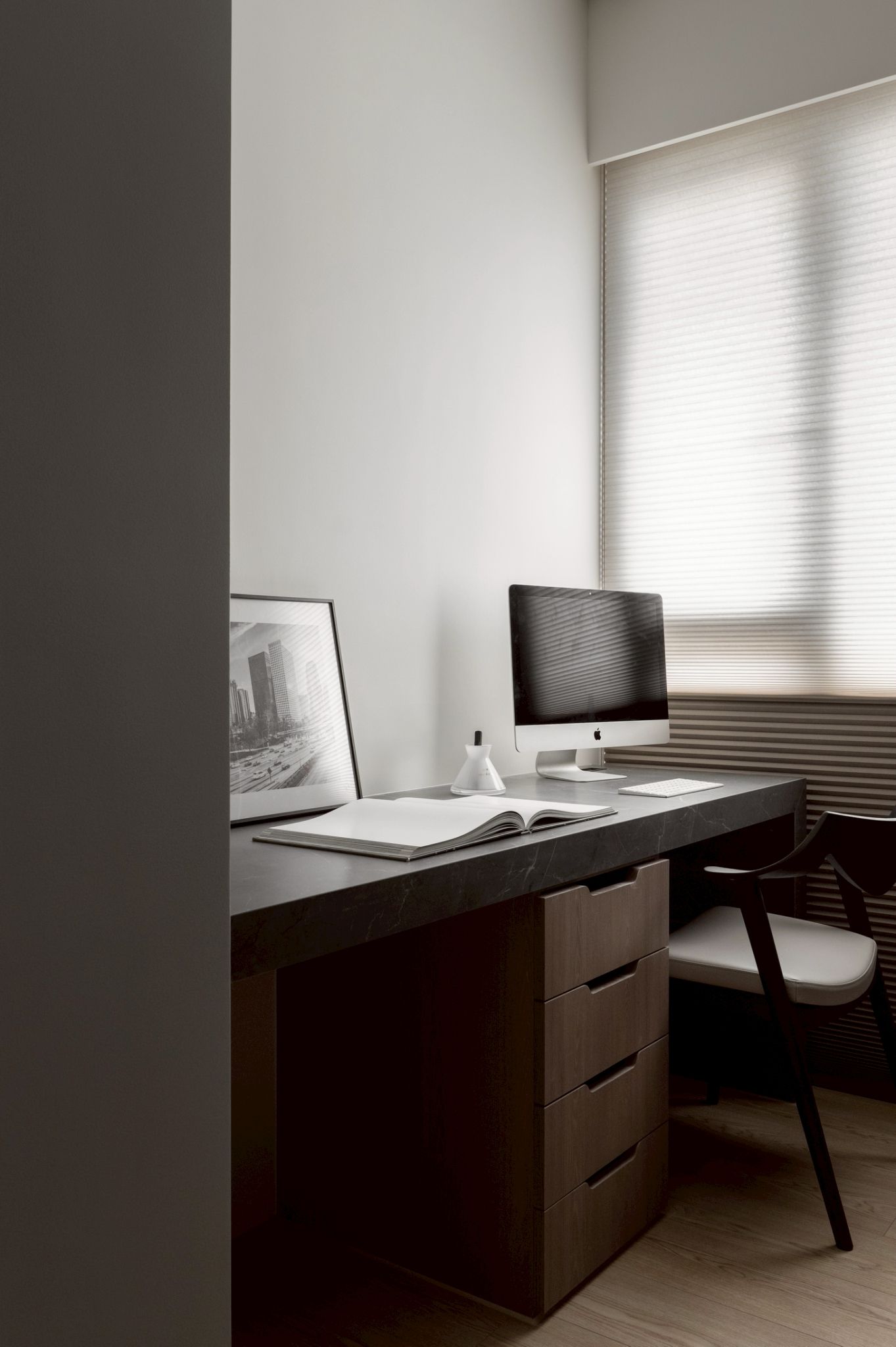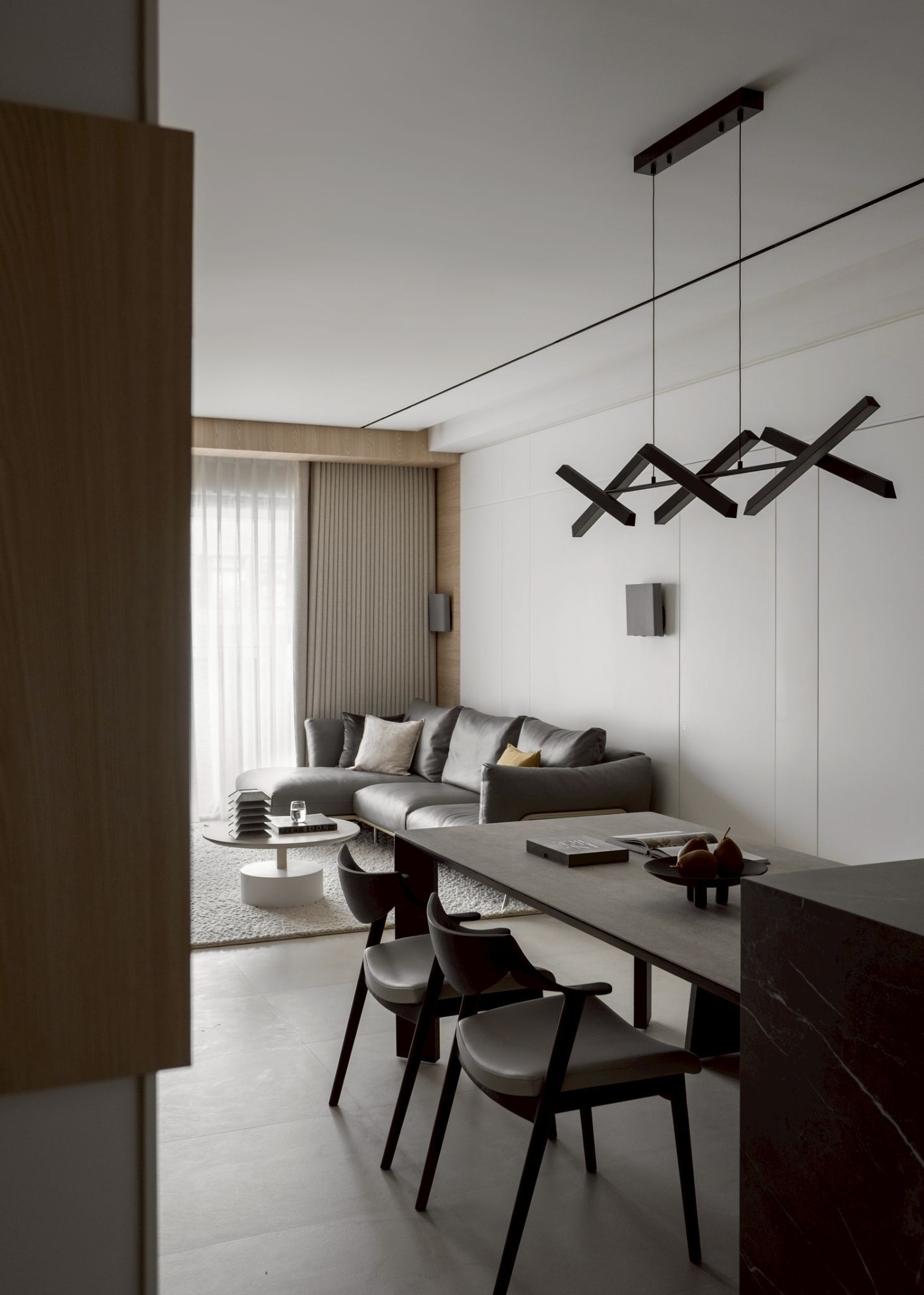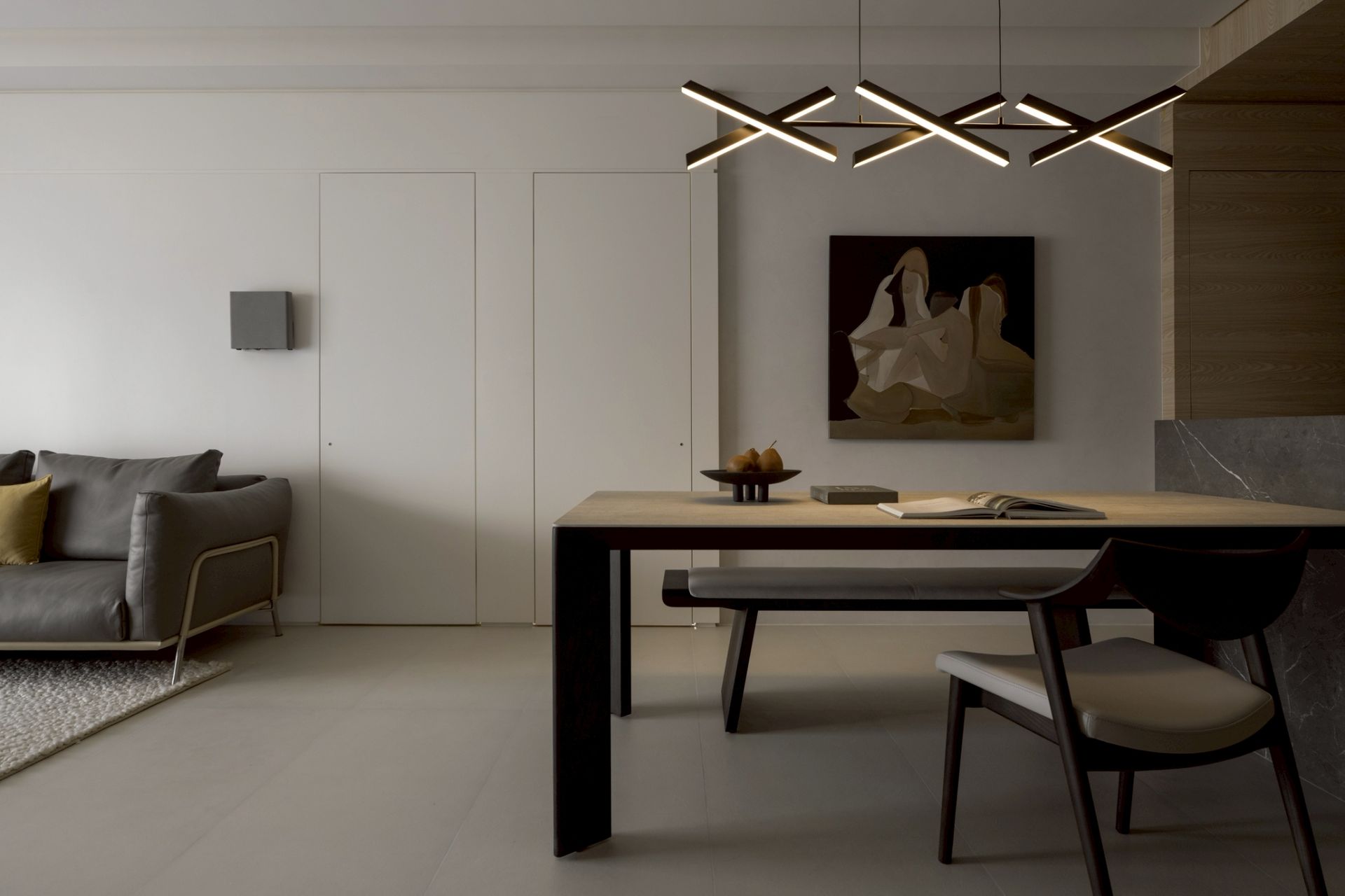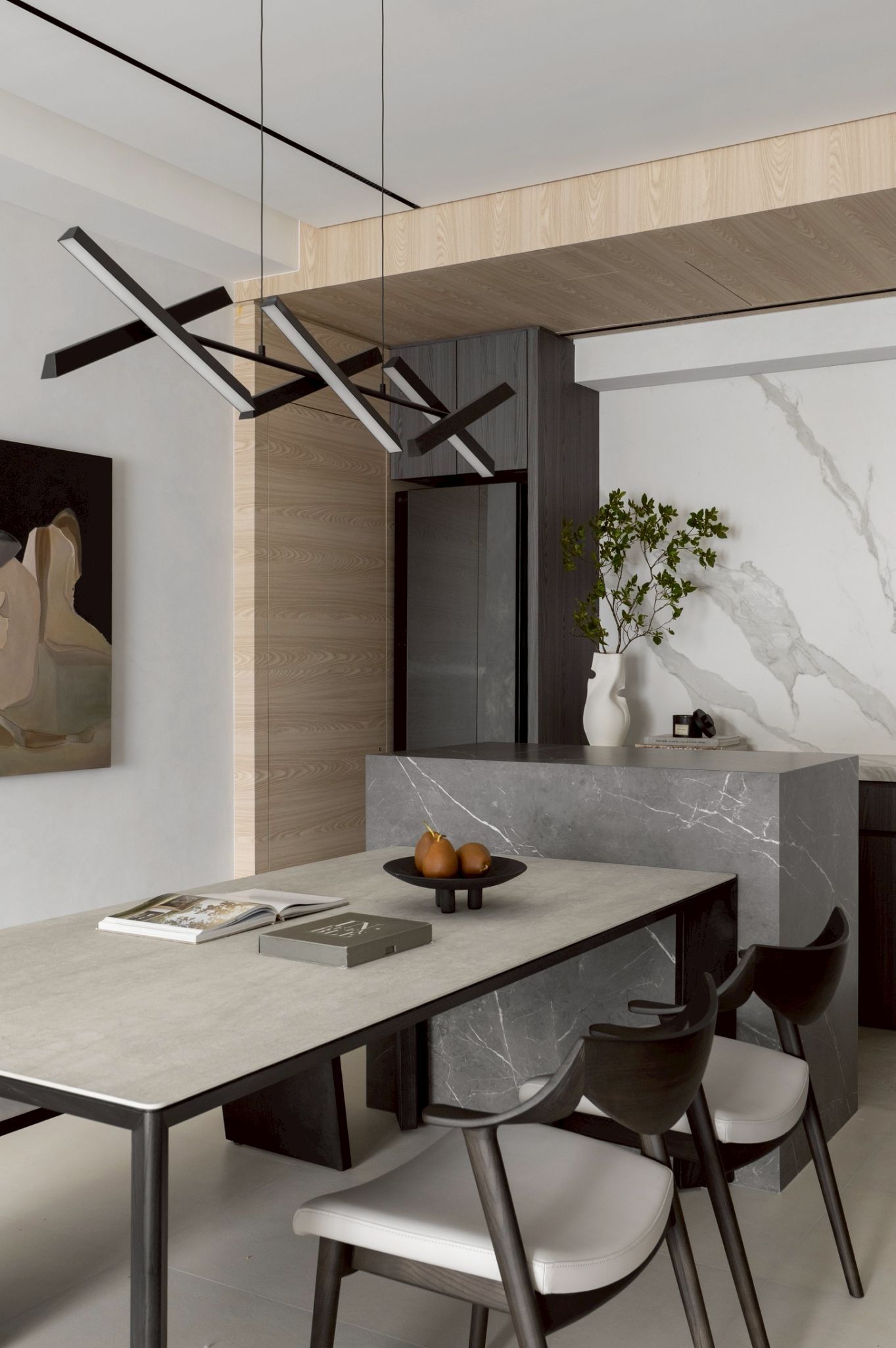 餐廳則以石紋陶板為桌面,搭配栓木桌腳與人造皮餐椅,不僅營造穩定視覺,也保有溫潤手感與日常舒適度,一旁的長凳則補足家的靈活性與親密感。