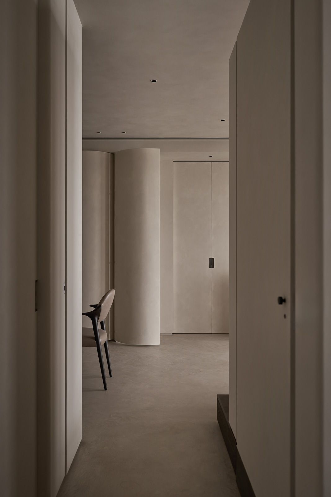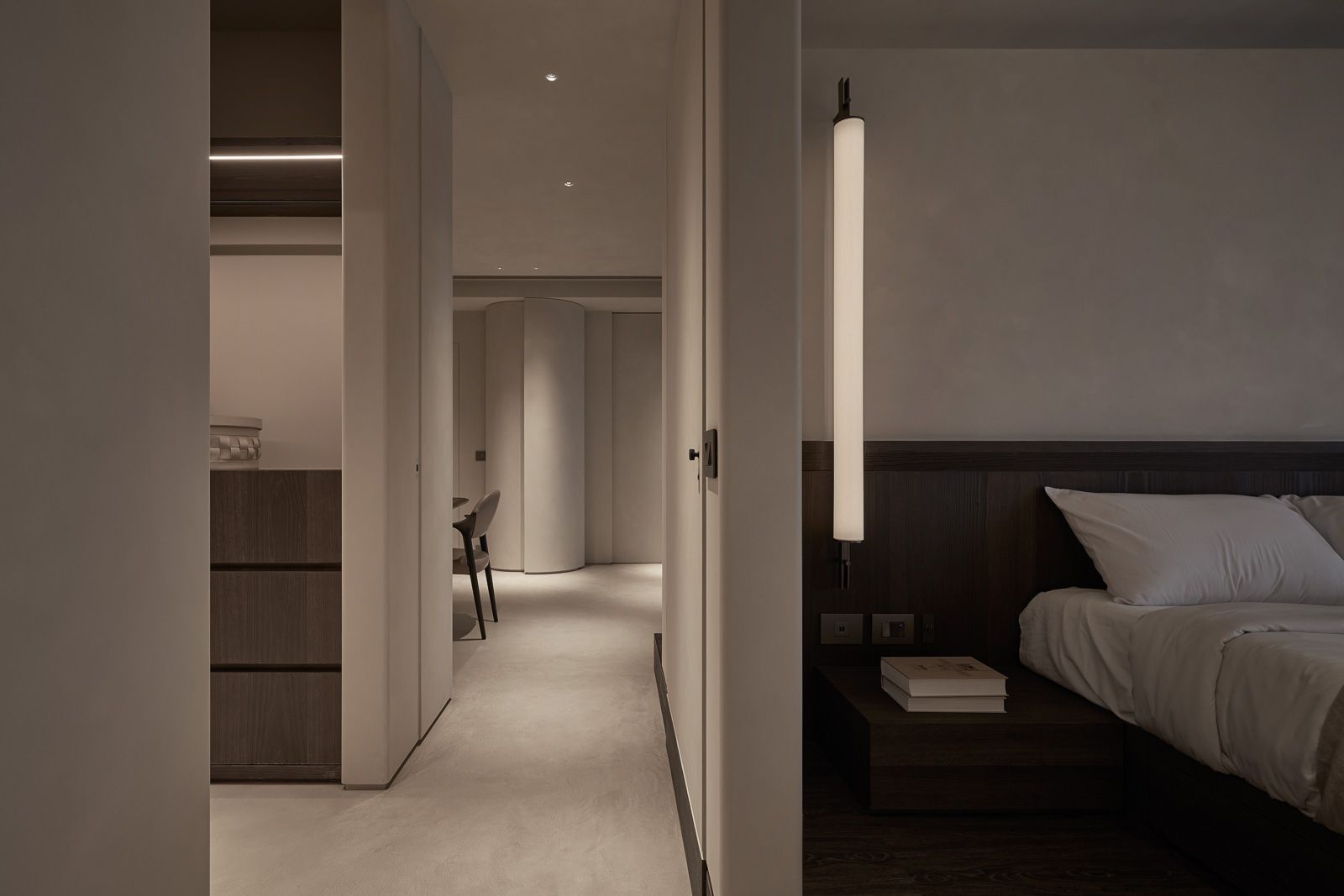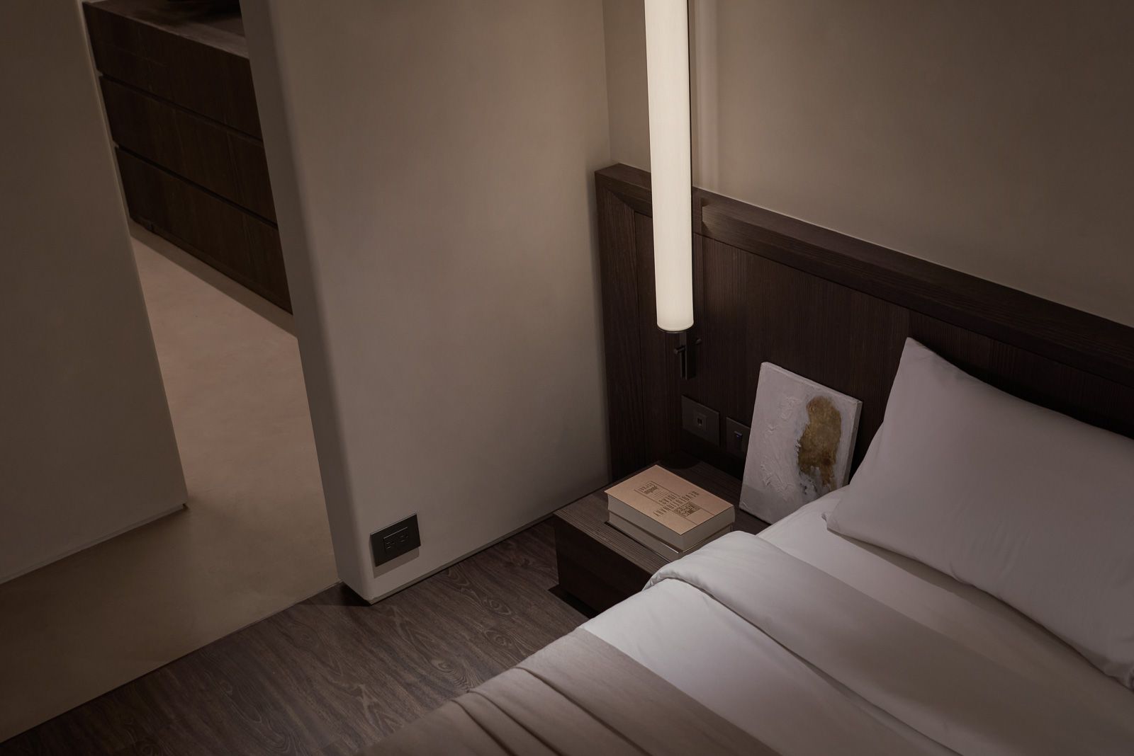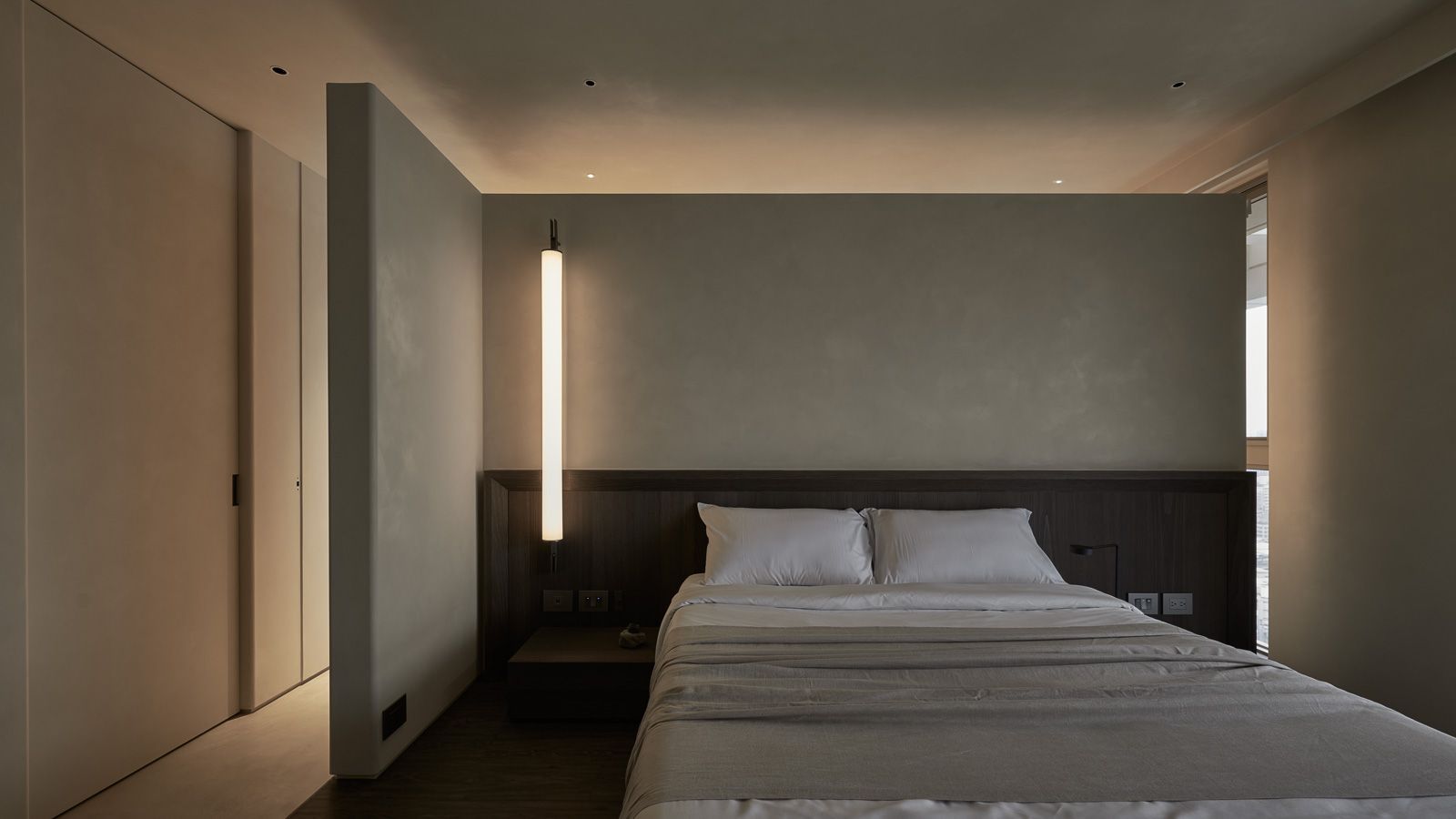 臥室床頭的垂直燈具設計新穎獨特,巧妙地與床頭板融合,營造出柔和的光線,讓人感到放鬆與舒適。