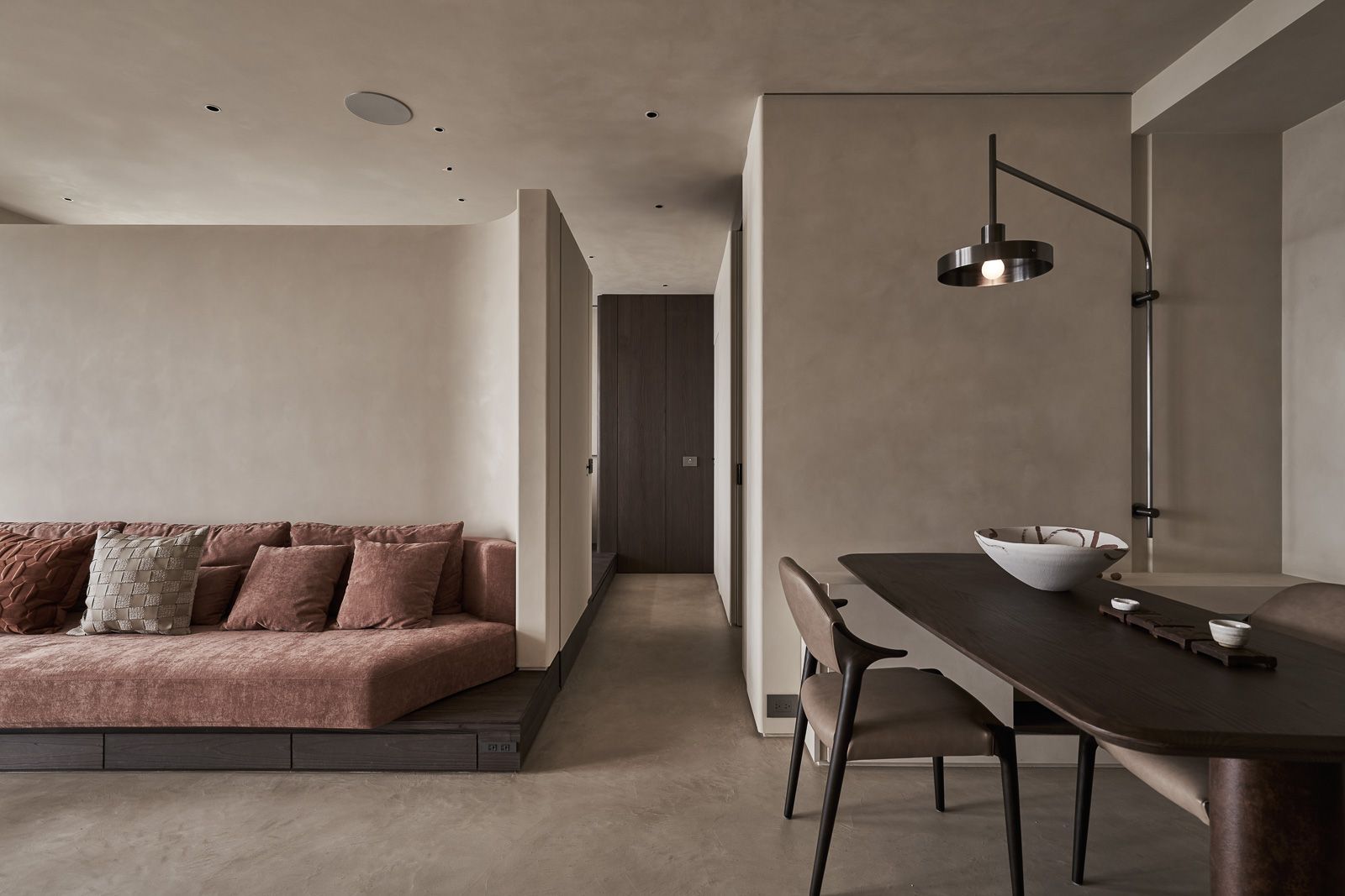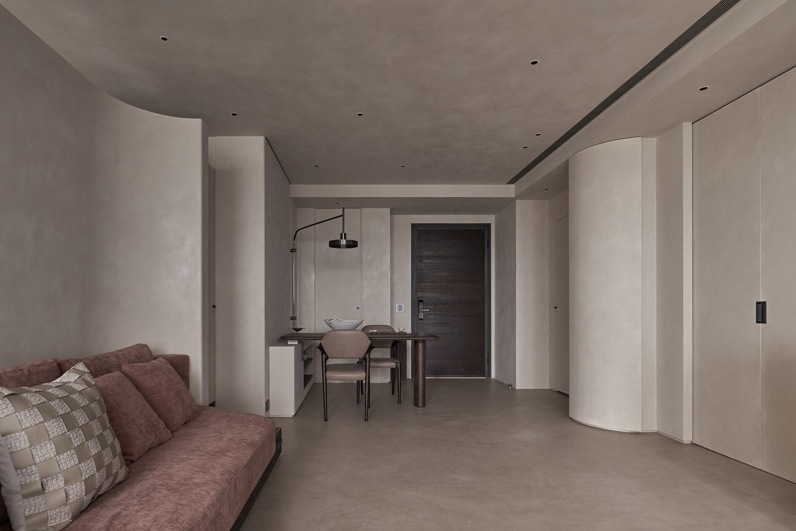 客廳橘粉色英國絨布沙發質感細膩,溫潤細膩的質感映襯著空間的靜謐氛圍,簡單的抱枕點綴其間,不喧賓奪主,反而為沙發增添一抹優雅層次。