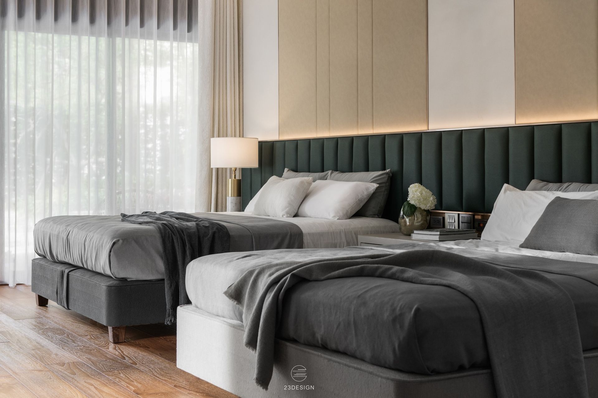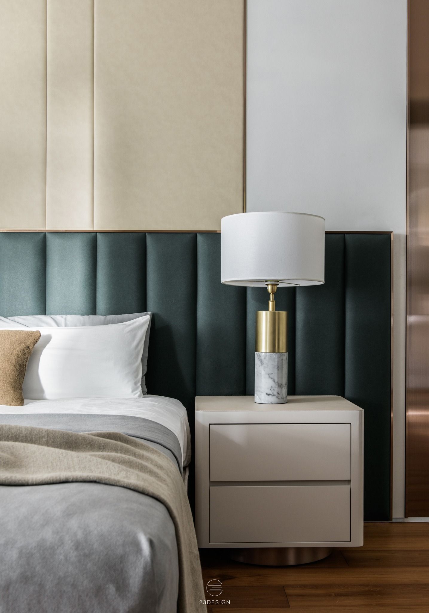 臥室中自然的木色與藍綠色床頭繃板相輔相成,沉浸在這與自然和諧共處的空間中,重新找回生活的節奏與平衡。